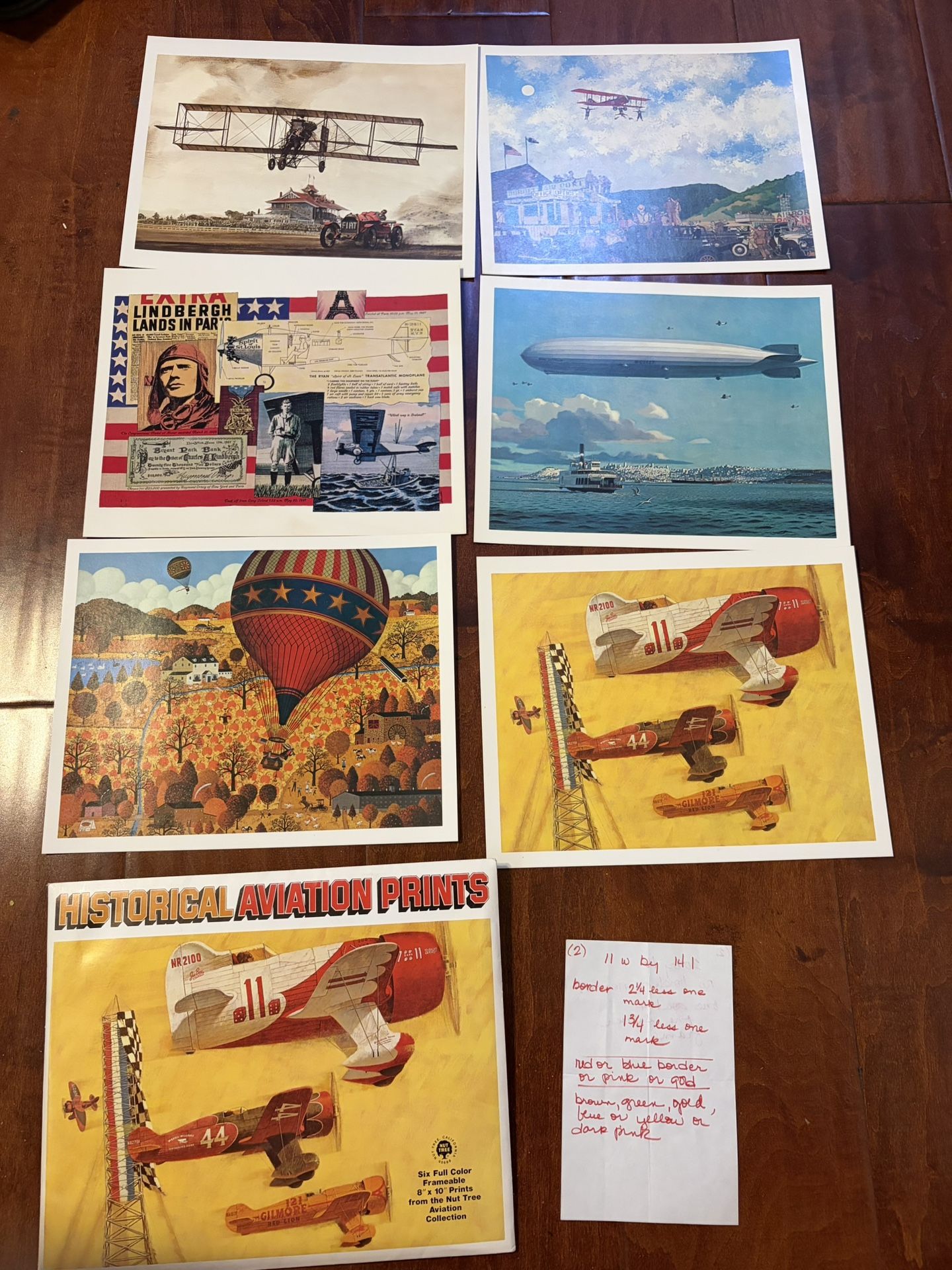 This listing is for a vintage full set of six (6) Nut Tree Historical Aviation art prints, dated 1974. The prints measure 8” x 10” each and were originally issued by The Nut Tree (California) as a collectible aviation art series. The set features iconic scenes and aircraft from early aviation history, including ballooning, pioneering pilots, air races, and historic aircraft. These prints were intended for individual framing and display. Details: • Complete set of 6 prints • Size: 8” x 10” each • Year: 1974 • Publisher: The Nut Tree • Printed in the USA • Full color artwork on paper Condition: • New old stock • Never framed or displayed • Includes the original Nut Tree mailing envelope • Prints are clean with vibrant colors • No tears or creases • Light age toning may be present from long-term storage • Some original handwritten framing notes are included; notes do not affect the artwork