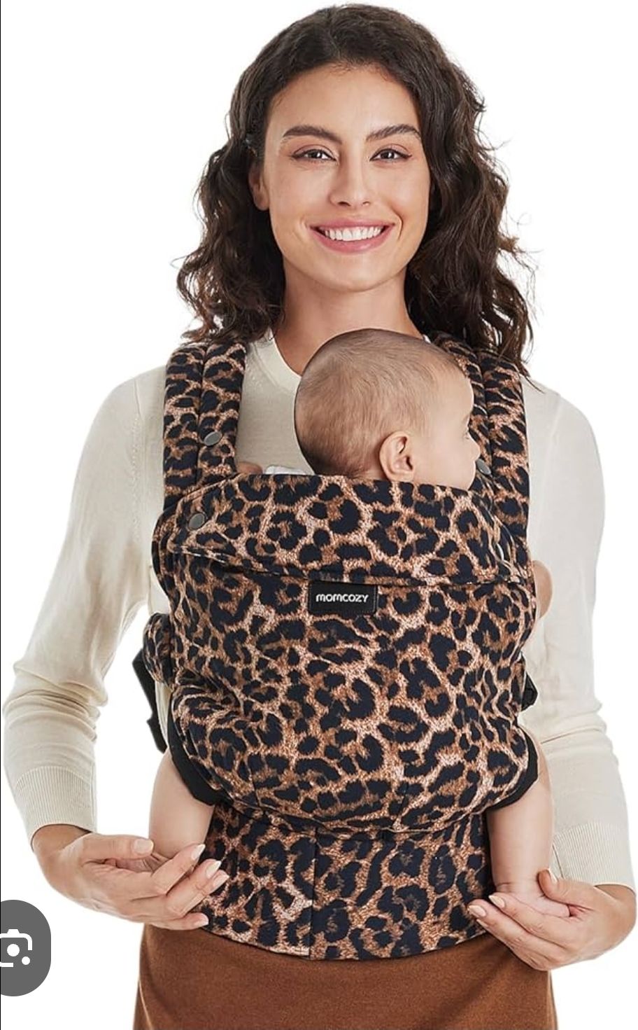 This item is a Momcozy baby carrier featuring a cheetah print pattern.