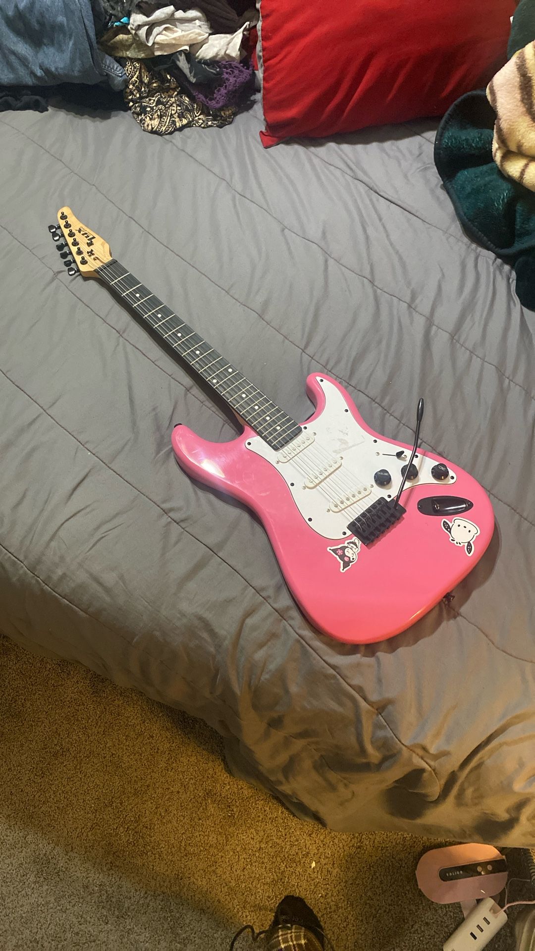 USED -has some stickers / sticker glue -comes: with extra strings, picks, starter kit user manuals, strap, tuner(battery included), capo, amp, and audio cable
