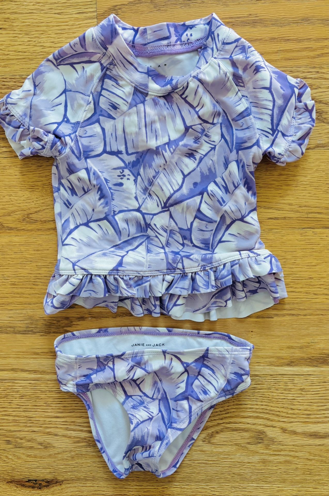 Janie and Jack 2 Piece Purple Leaf Rash Guard & Bikini Bottom Set. Size 2T and made of a nylon/spandex/polyester blend. Gently used and in great condition.