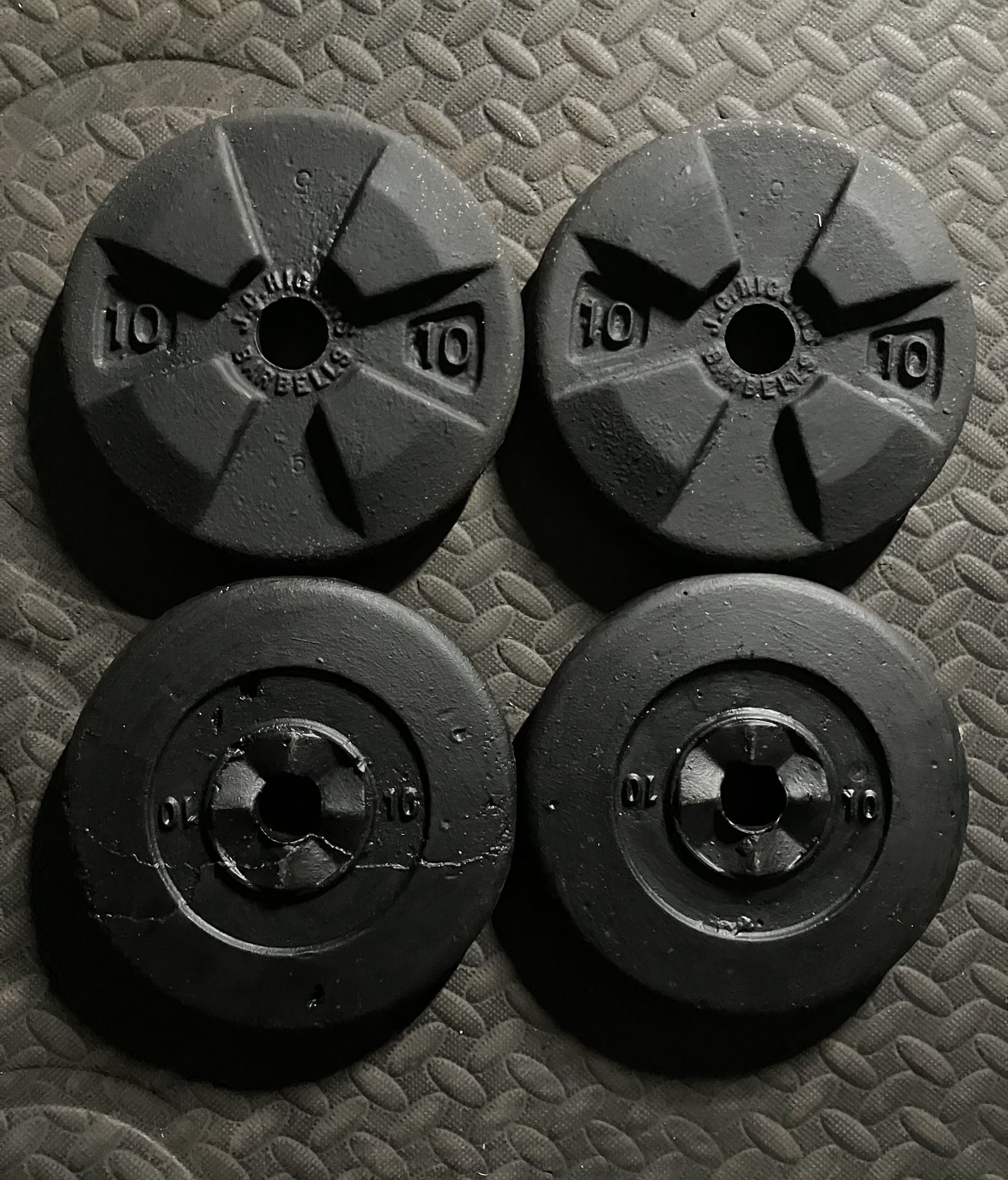 Standard 1" center hole 10lb x4 = 40lbs total of cast iron weight plates for $30 cash. Price is firm. Pick up anytime in Cleveland 44135. No payment apps. Thank you.