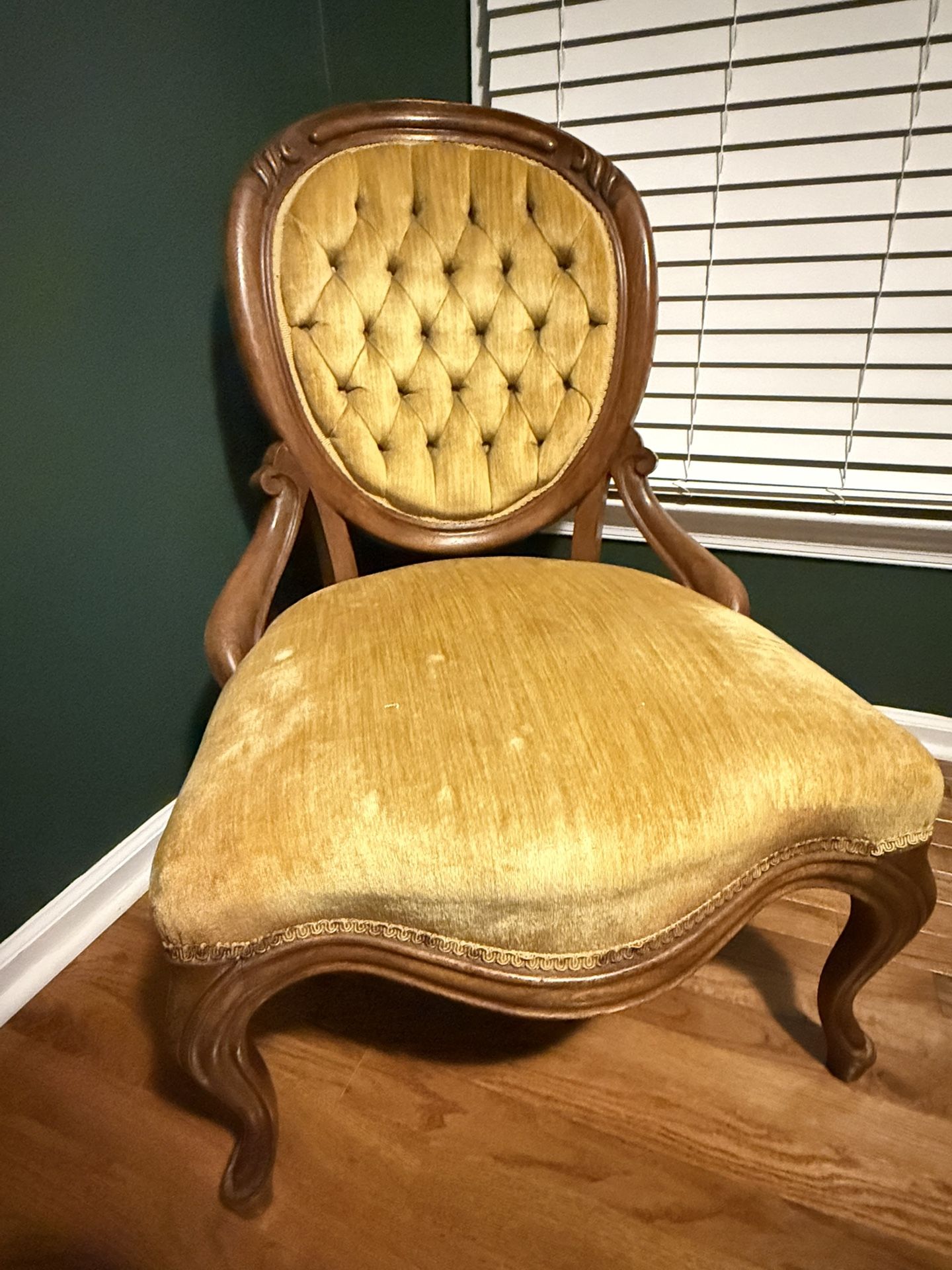 Gold/Yellow Vintage Tufted Victorian Style Slipper Balloon Back Chair. The carved wood frame and tufted golden velvet upholstery make it a perfect accent piece for a reading corner, bedroom, or living room. Details: Solid wood frame with carved detailing. Tufted backrest with classic Victorian silhouette. Warm golden velvet upholstery. Leather ottoman included. Comfortable, sturdy, and has great character. From a smoke-free home Condition: Good vintage condition with normal wear from age. Upholstery is intact and the chair sits solidly Reason for selling: We love this chair but it no longer fits in the area that it was used for. Price: $120.00 or best offer — open to reasonable negotiation.