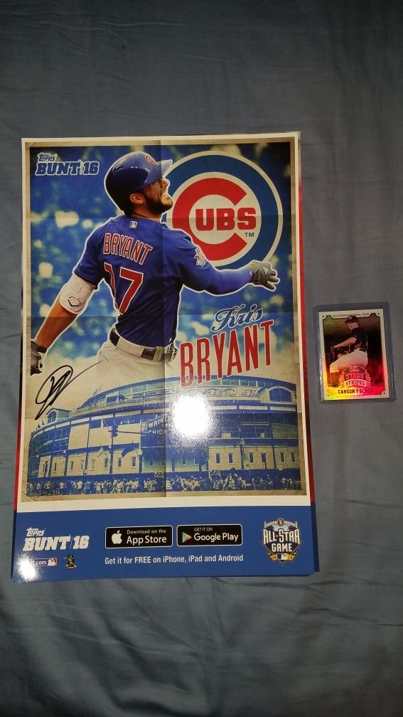 Limited edition jumbo Kris Bryant card by Topps Bunt. Limited edition and was only available at the All-Star Game FanFest in 2016. Over 17 inches tall, I put a normal-sized baseball card next to it to show you the size difference. CARD IS NOT FOLDED THAT'S JUST THE DESIGN.