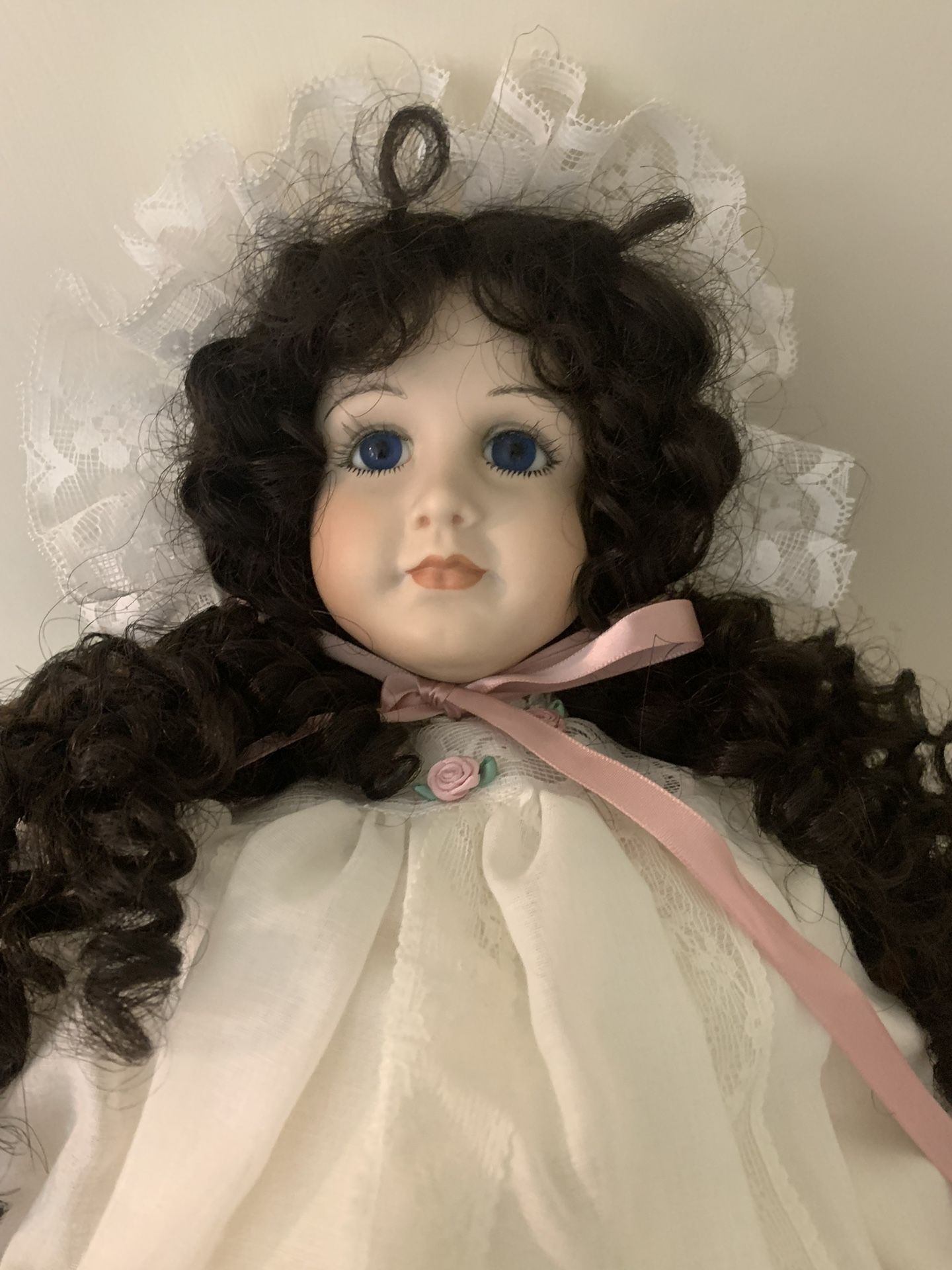 VINTAGE PORCELAIN BABYDOLL W/ BEAUTIFUL WHITE OUTFIT & LONG DARK HAIR DOLL IS IN EXCELLENT CONDITION 20 H