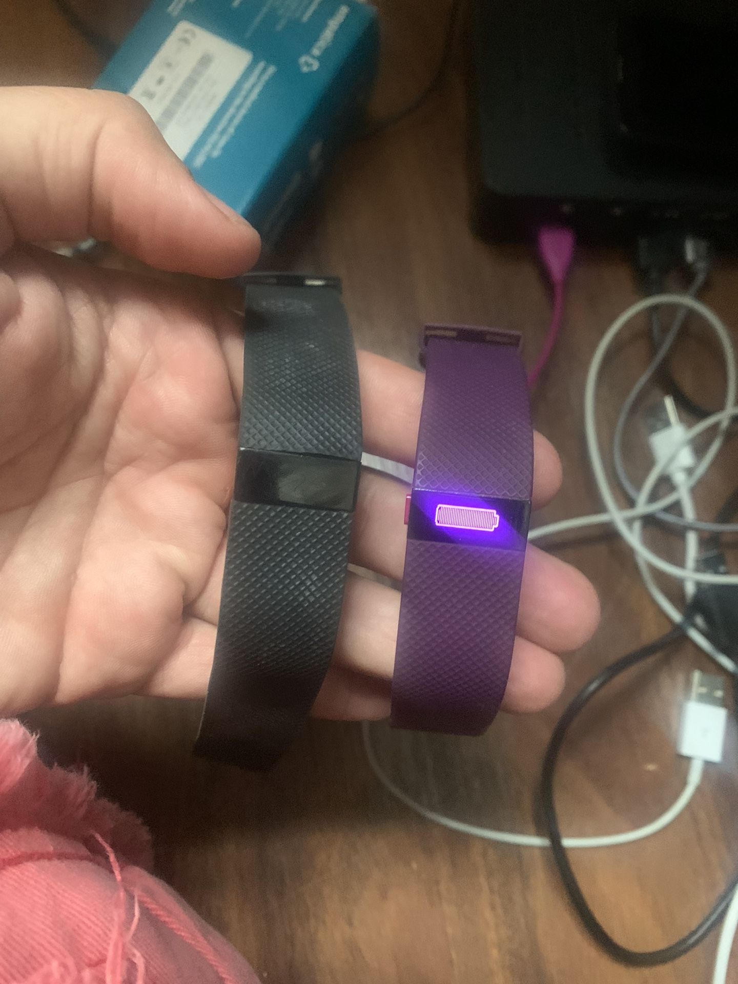 Selling 2 Fitbit The black one is large and missing a button The pink one works fine and isn’t missing anything There is only 1 charger. 10 dollars for both.