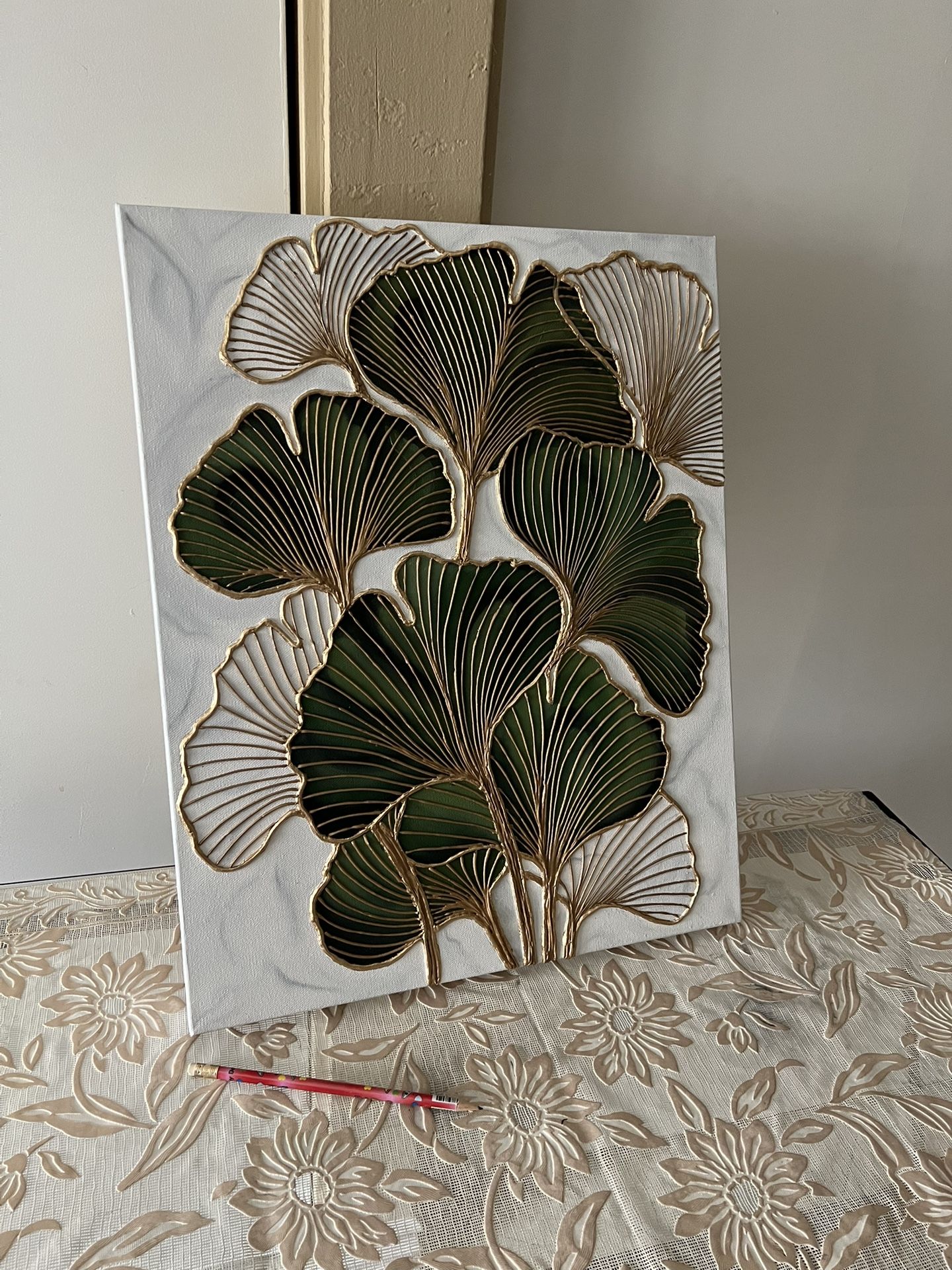 Beautiful Gold Green Ginkgo Leaves Painting Hand Painted Textured Art