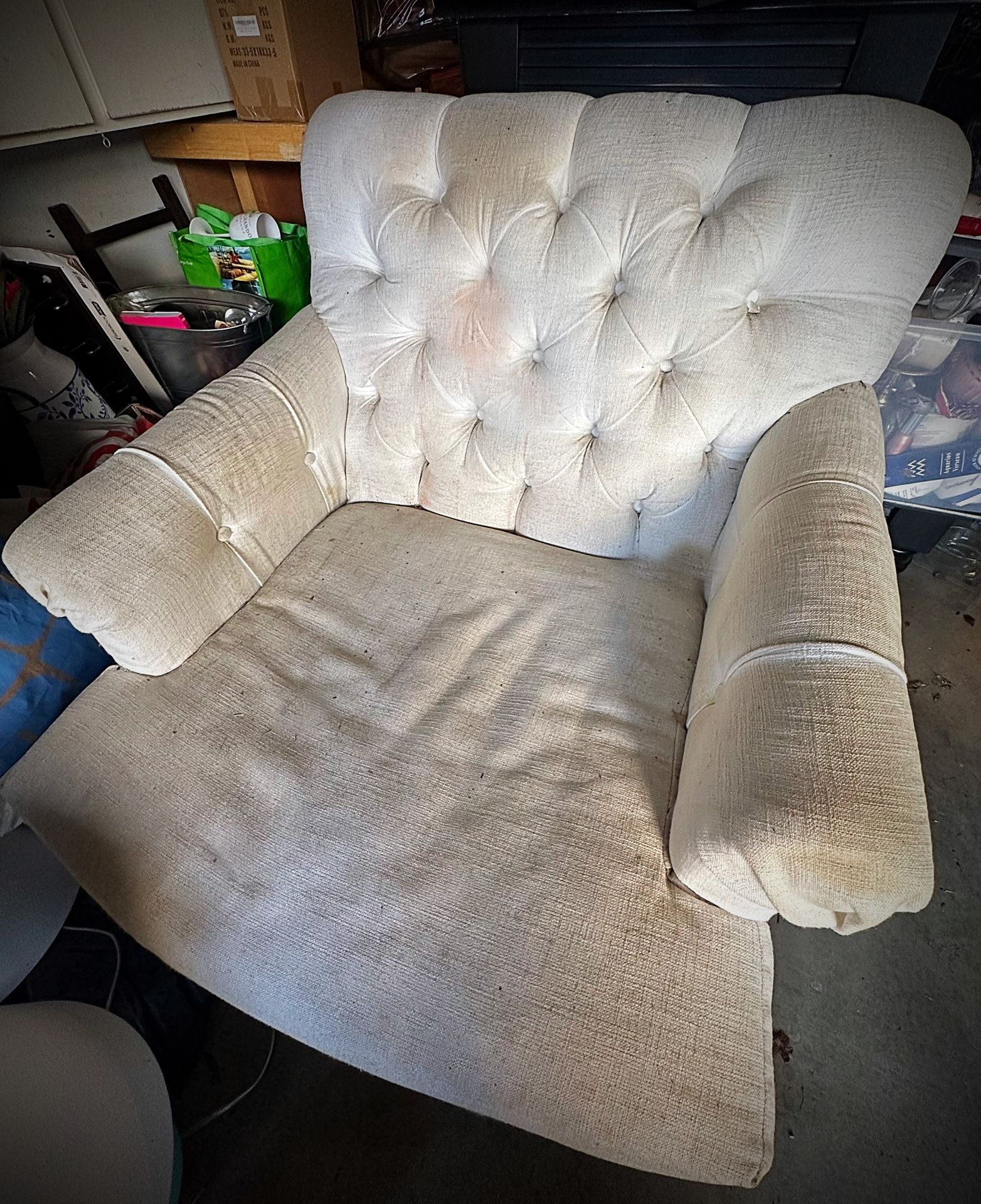 White farmhouse style comfy chair. Needs a deep clean but it’s super cute comfy & sturdy.