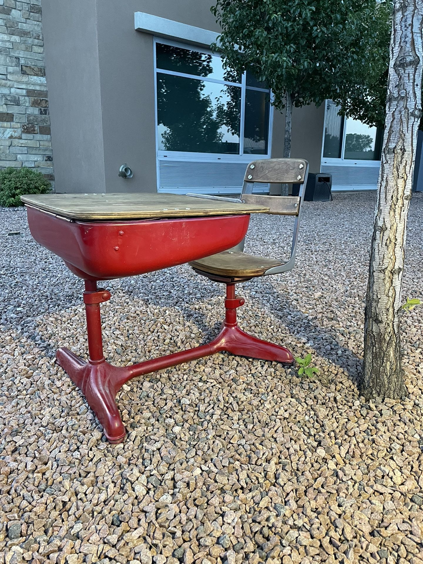 Vintage School desk! Great color scheme! Great decor piece! Everything in working condition! Swivel seat! Open and closes just fine!! Great Flash back item!