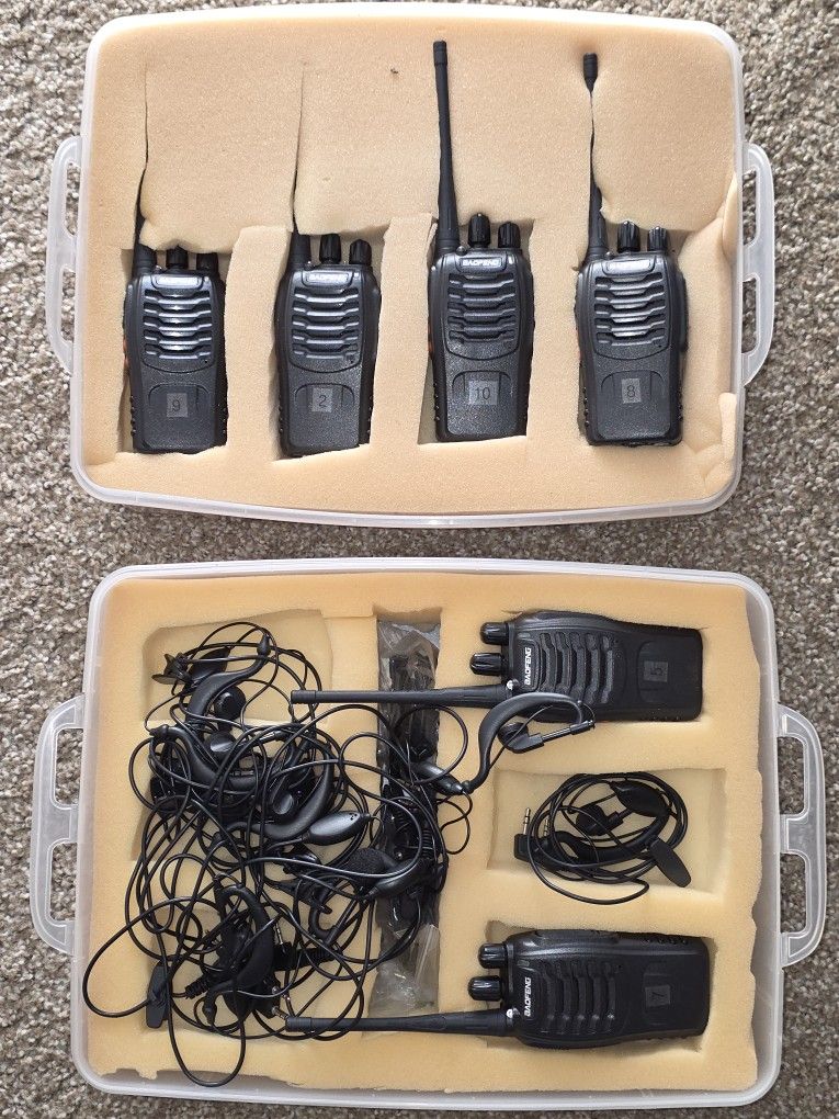 Never used, Set of 6 radios. Ultra high frequency UHF. Comes with push to talk earpieces. Model: BF-888S. Just needs a charger. I lost it a few months back.