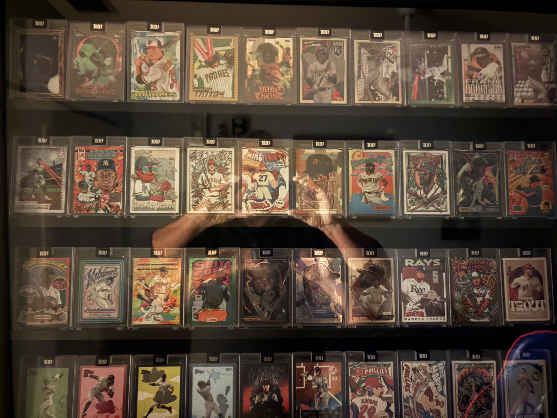 Topps Project 100 was a set of 100 individual cards created by artists with each card having a base run of 3999. There are also numbered /299 . Of the 52, 5 are PSA graded and several numbered /299. Cards shown include Judge, Trout and JRod. update: 8 cards sold from list. Contact for pricing for individual cards or the remaining set