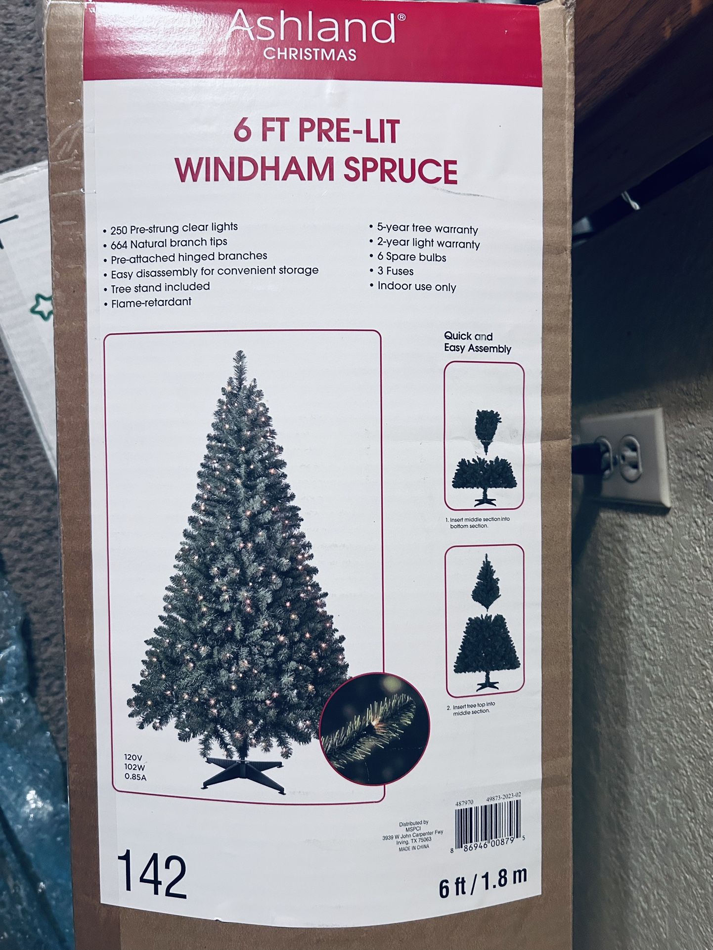 This 6 foot pre-lit tree is new never used. Lights work ( I checked), is perfect to spruce up your home. Comes in three sections and is easy to assemble and disassemble. Includes tree stand. Pick up East Palmdale PM me if interested