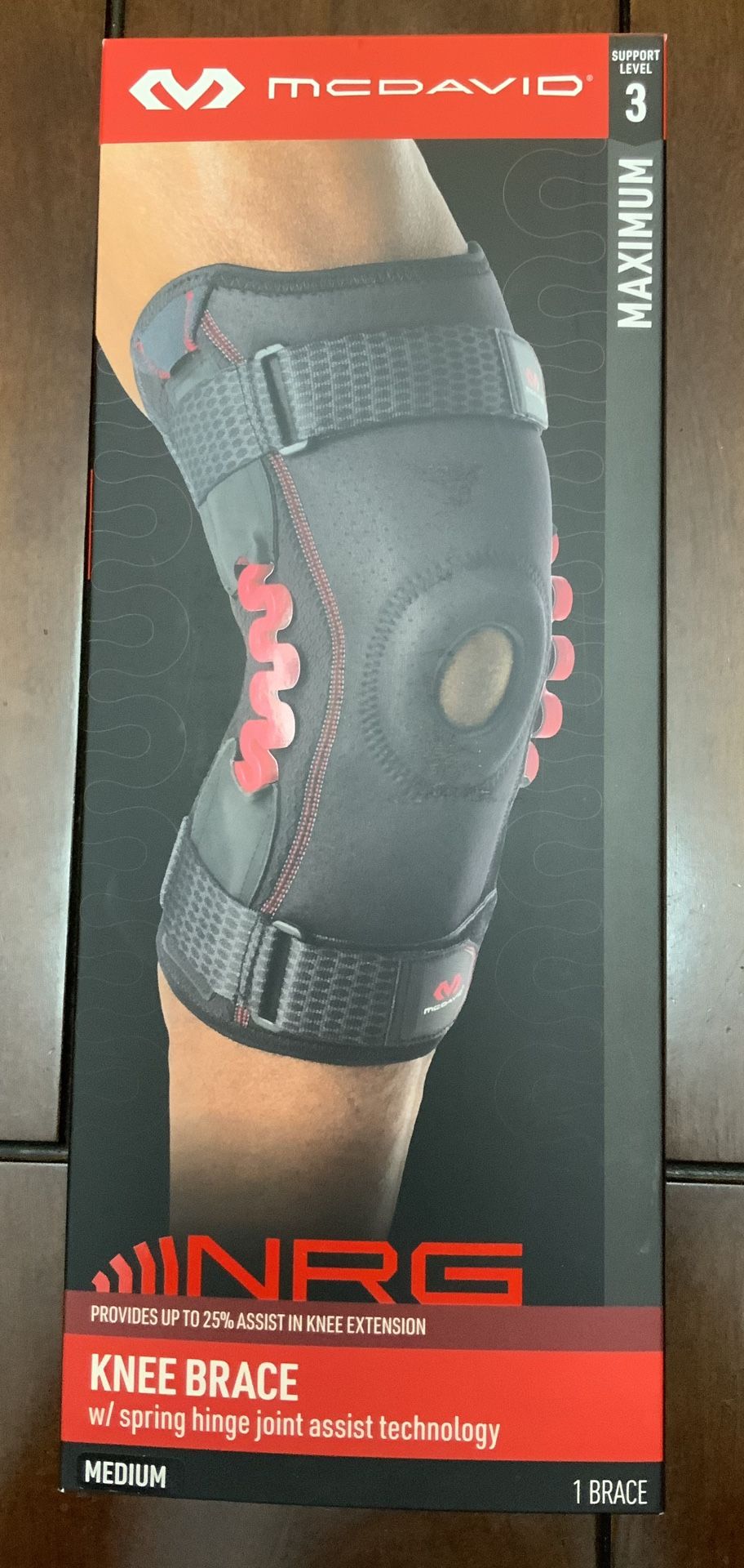 New. The McDavid NRG Spring Hinge Knee Brace is best for moderate to major joint instabilities, recovery from sprains and strains, reducing fatigue, and post-surgical joint protection and rehabilitation. Spring Hinge Joint Assist technology helps relieve tension and stress on muscles and knee joint, reducing stress on knees up to 25%*. NRG helps reduce fatigue during activity, aiding in knee recovery. Integrated non-stretch adjustable straps ensure personalized fit. Size: M Support level: 3 Maximum