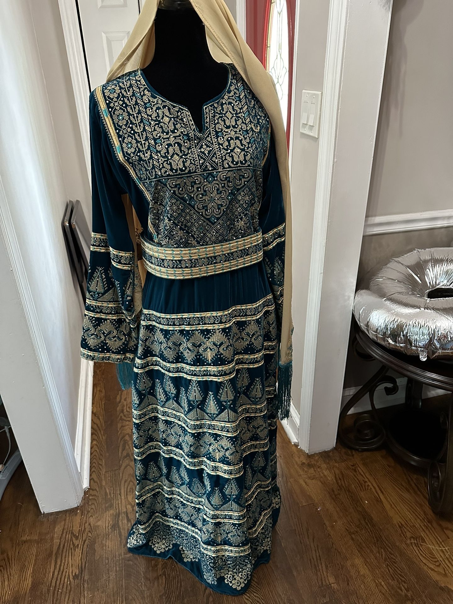 Custom made mukhmel (velvet) thoub. Should fit a size large. Mukhmel is a nice teal color, entire thoub filled with machine stitching. The back has a zipper as shown in pictures. Entire thoub has rhinestones throughout. Has a matching khirka (head scarf) as shown in pictures. Thoub looks even better in person. My lighting and camera wasnt the best quality.