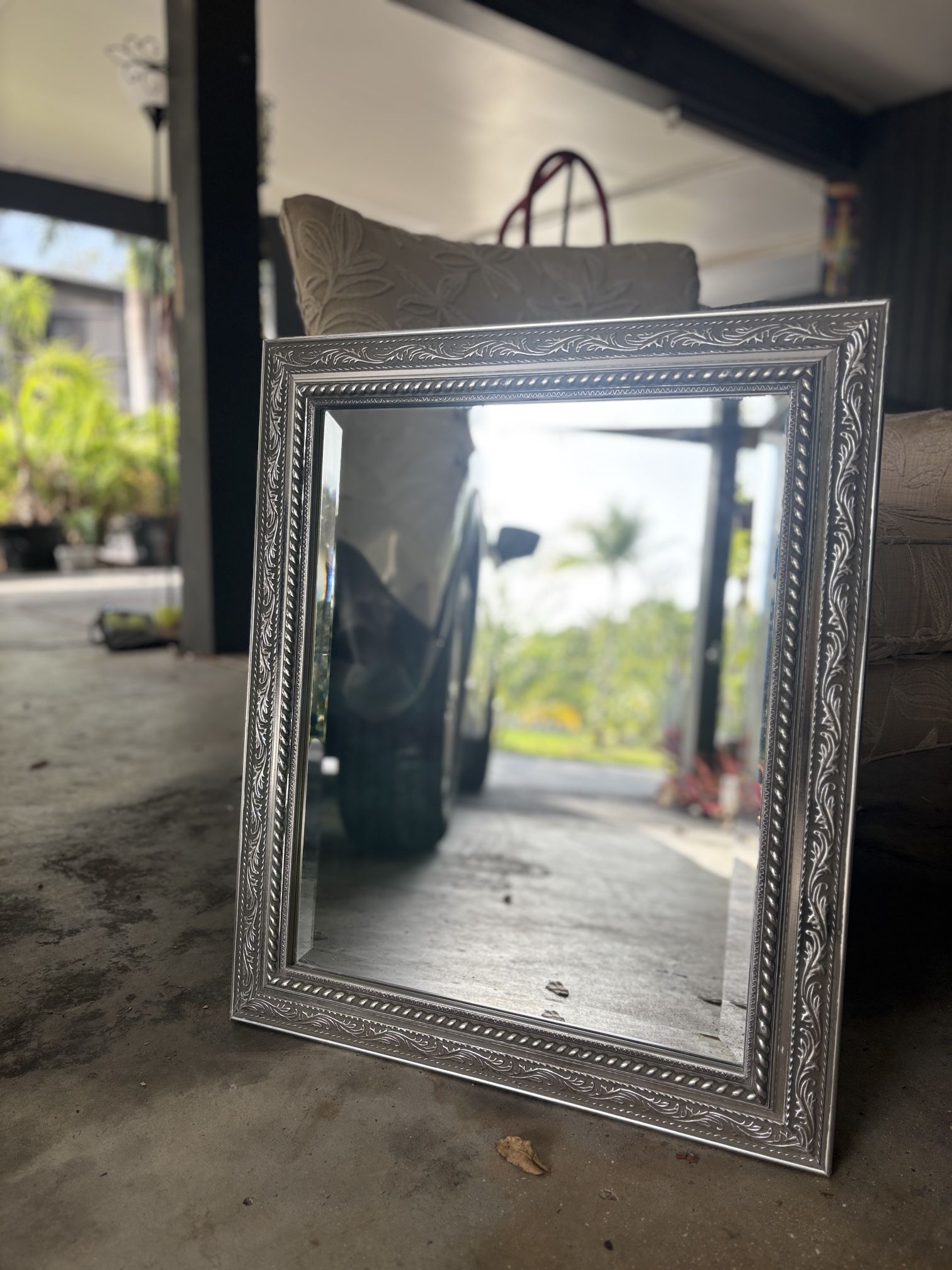 Silver framed mirror in decent condition. Most of the imperfections can not be seen when mirror is hanging. 16”w x 20”h