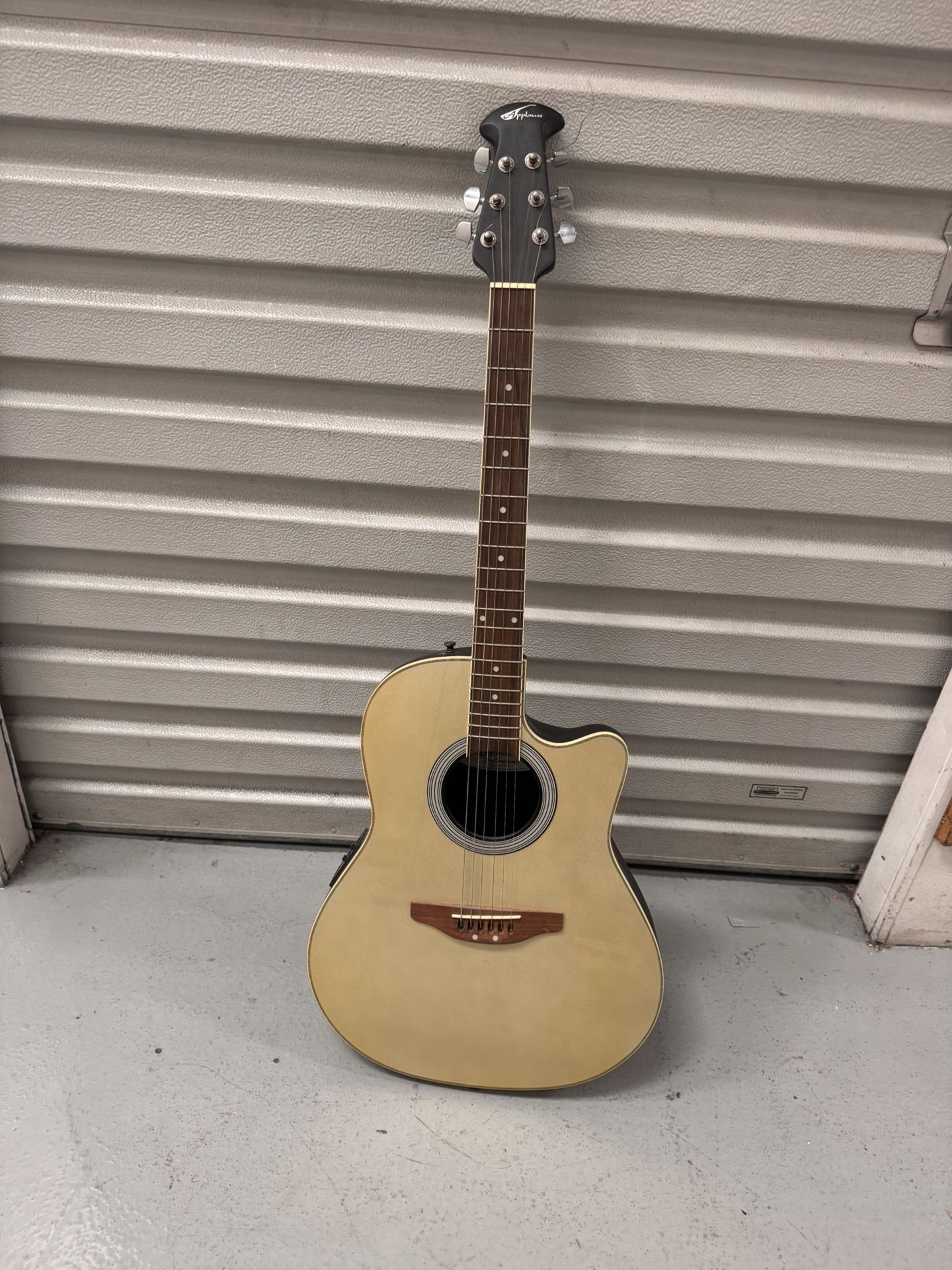 Acoustic-electric guitar from Applause by Ovation with a striking gold finish. Features a cutaway body for easy access to higher frets and built-in EQ with tone and gain sliders. Lightly used and in clean condition. I’m not a guitarist myself so I don’t know how it plays, sold as-is. Pickup in Hollywood.