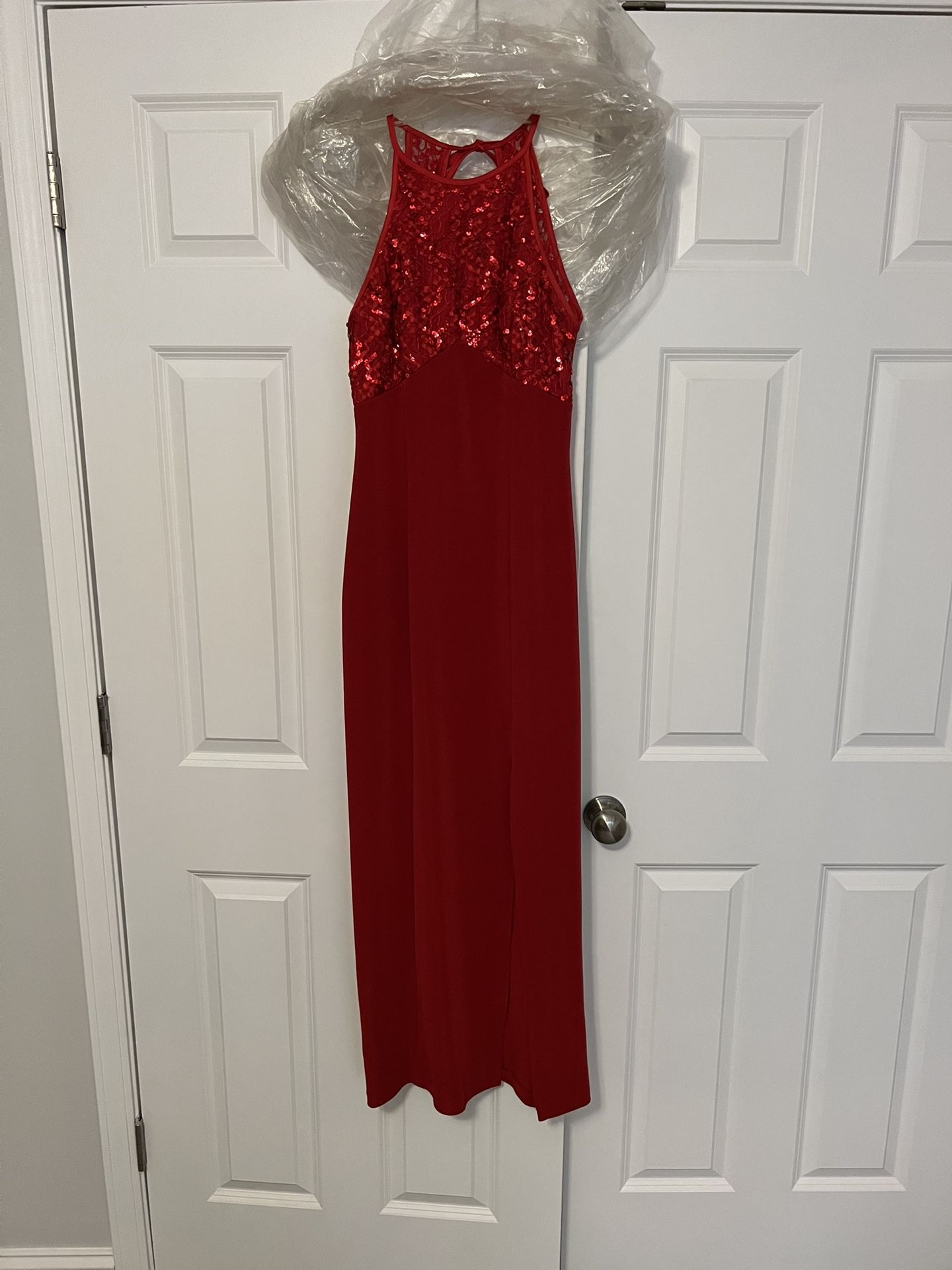Gorgeous red halter dress with beaded detail in front and back. I wish it still fit me! No try on. Low price to acknowledge this. Cash only. Pick up only.