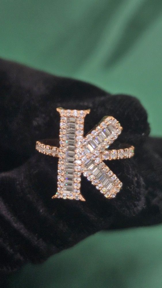 This custom initial ring features a fully iced-out “K" design, crafted with precision-set baguette and round-cut stones for maximum shine. The layered stone layout gives it a unique depth and luxury feel, making it stand out from every angle. Set on a sleek band, it balances boldness with everyday wearability. Perfect for representing your name or someone special. A true statement piece built to shine nonstop.