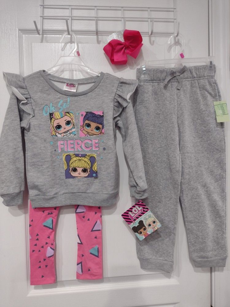 LoL surprise leggings set with gray sweat from Highland to match the long sleeve shirt. This includes a large pink hair clip. Girl size 5/6. All for $20 ! New