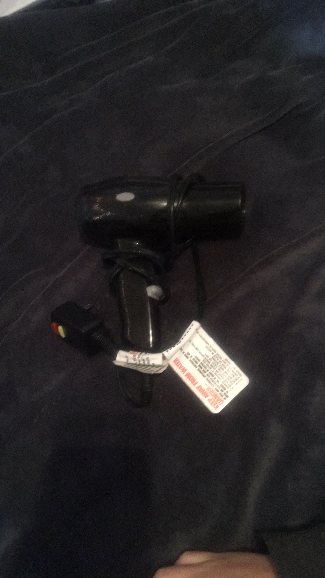 Black hair dryer, has low and high setting, also has a button for cold air instead