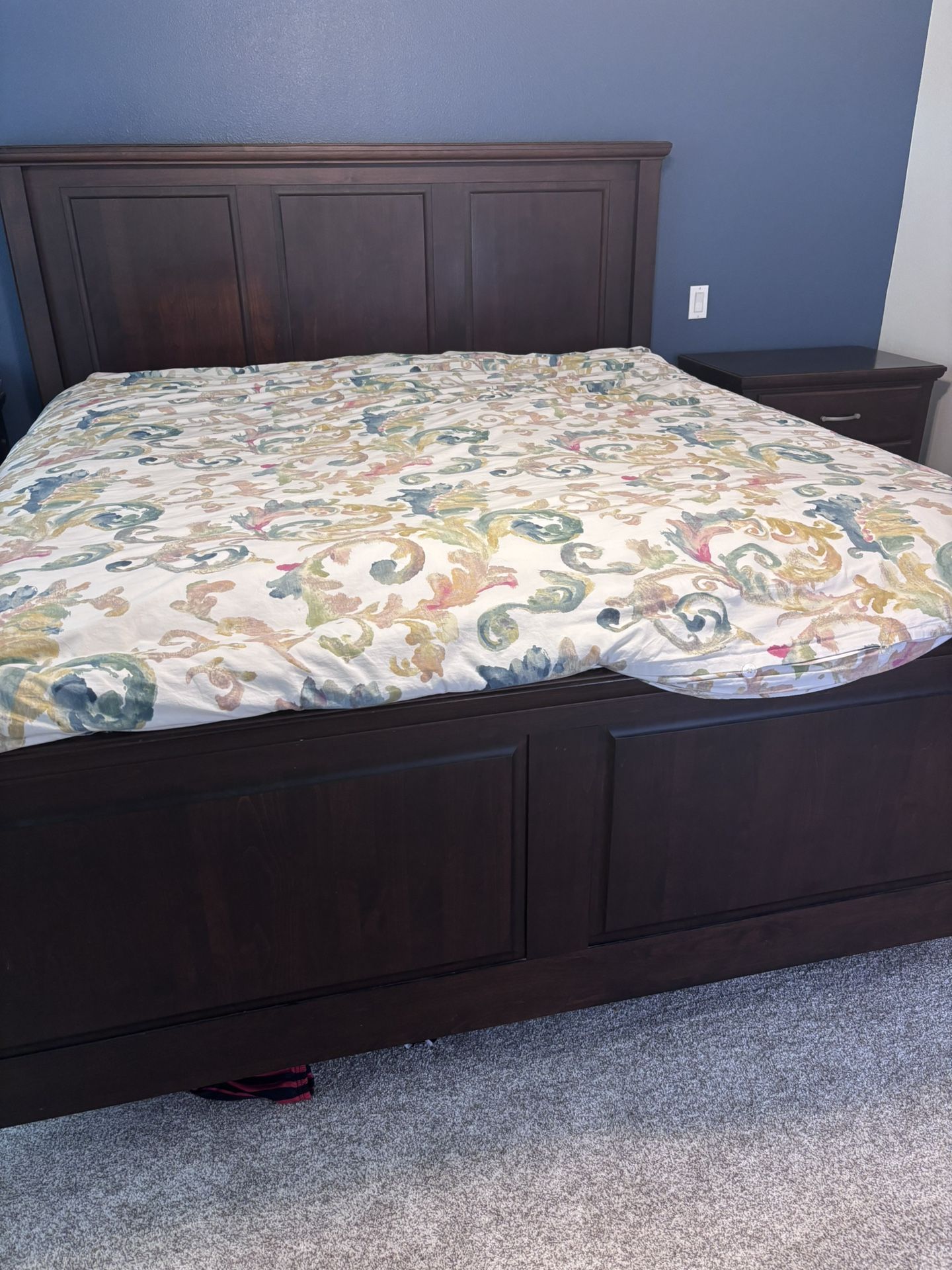 California King Bed (no mattress) with (2) matching nightstands. Solid wood. Must be able to pick up - we cannot deliver. Cal King Box Spring available as well