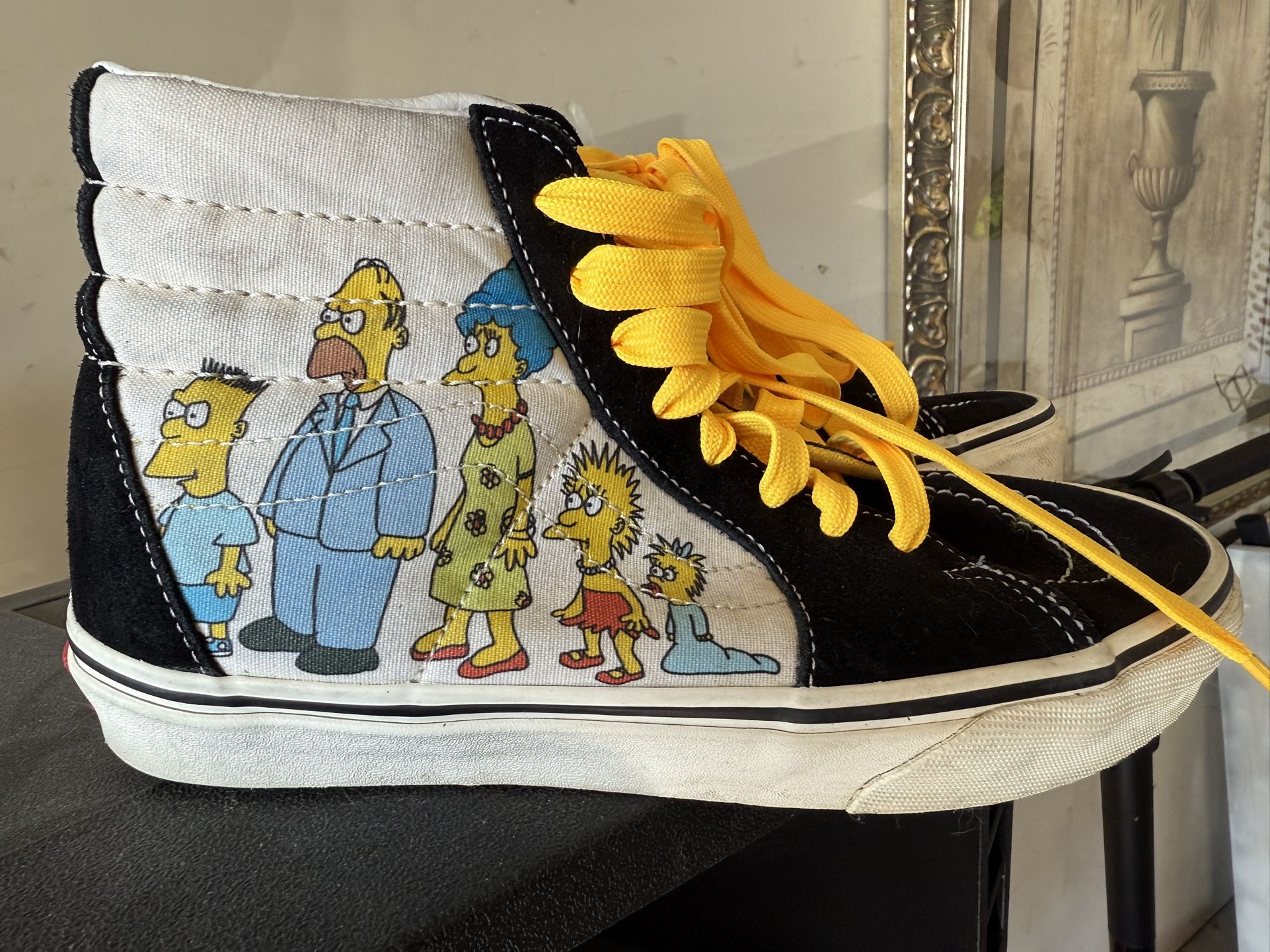 New Women’s Size 7.5 Men’s 6 Parmer Lane and Anderson Mill Cash Only Iconic Vans high-top sneakers featuring The Simpsons family graphic on the side panel. Classic black suede and canvas construction with bold yellow laces that really pop. A fun, collectible pair for fans of Vans or The Simpsons. Details: • Brand: Vans • Style: High-top sneakers (Sk8-Hi style) • Design: The Simpsons family graphic • Color: Black, white, yellow • Closure: Lace-up • Condition: Used once for an hr, good condition • Graphics are still vibrant Perfect for casual wear, collectors, or anyone who loves statement shoes with personality. 📦 Sold as pictured 🚭 Smoke-free home 💬 Message me with questions or for more photos