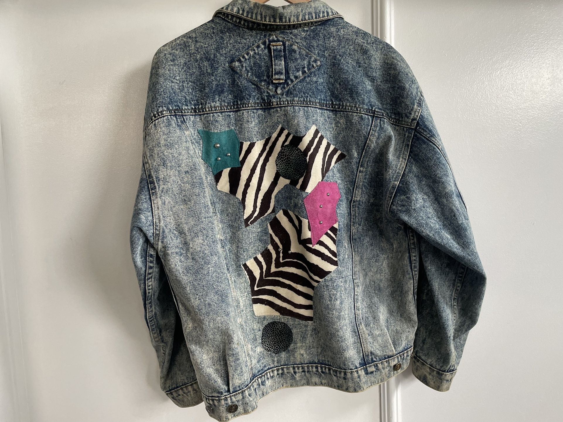 Vintage Acid Washed 80s Jeans Jacket Size is between large / xl Zebra / Pink / Teal pattern on back