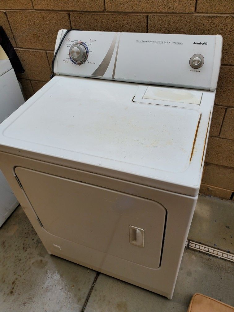 Used Dryer Slightly worn top. (Just need to spray paint it and it will look brand-new.) Thermal fuse need to be replaced. (Thermal fuse cost is under $15)