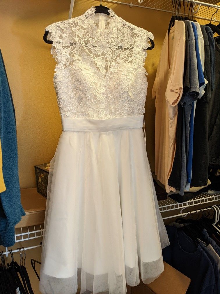 Size 10. Never used. Beautiful lace and chiffon. Handmade.