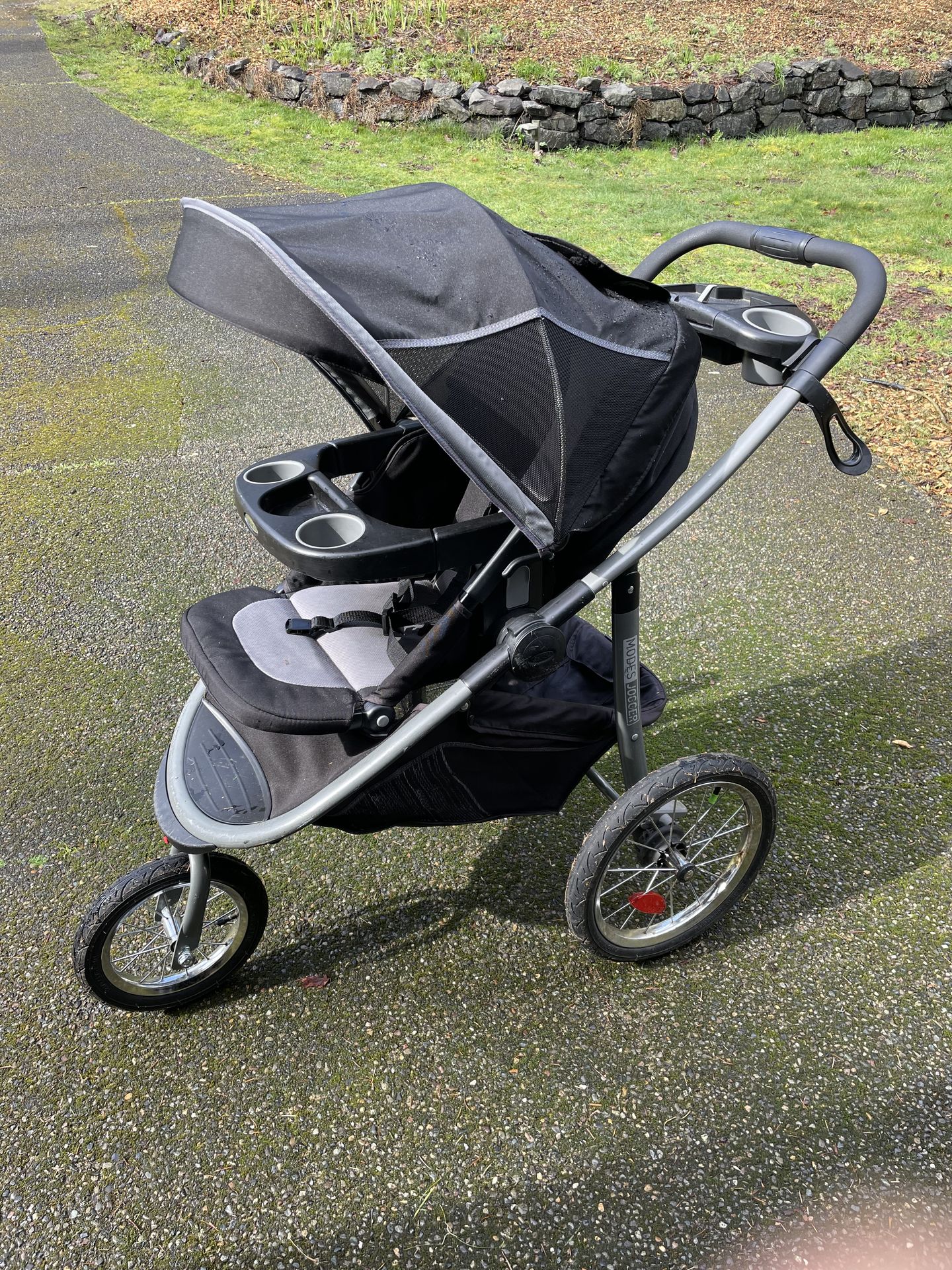 Jogging stroller. New back tires. The stroller is compatible with Graco infant car seat as well. Just unhook the existing seat and clip in the car seat (facing you). This allows you to use it from the time they are born. We used it in the airport. A small carryon luggage can fit in the bottom! The airline would always check the stroller at the gate, which was super handy.