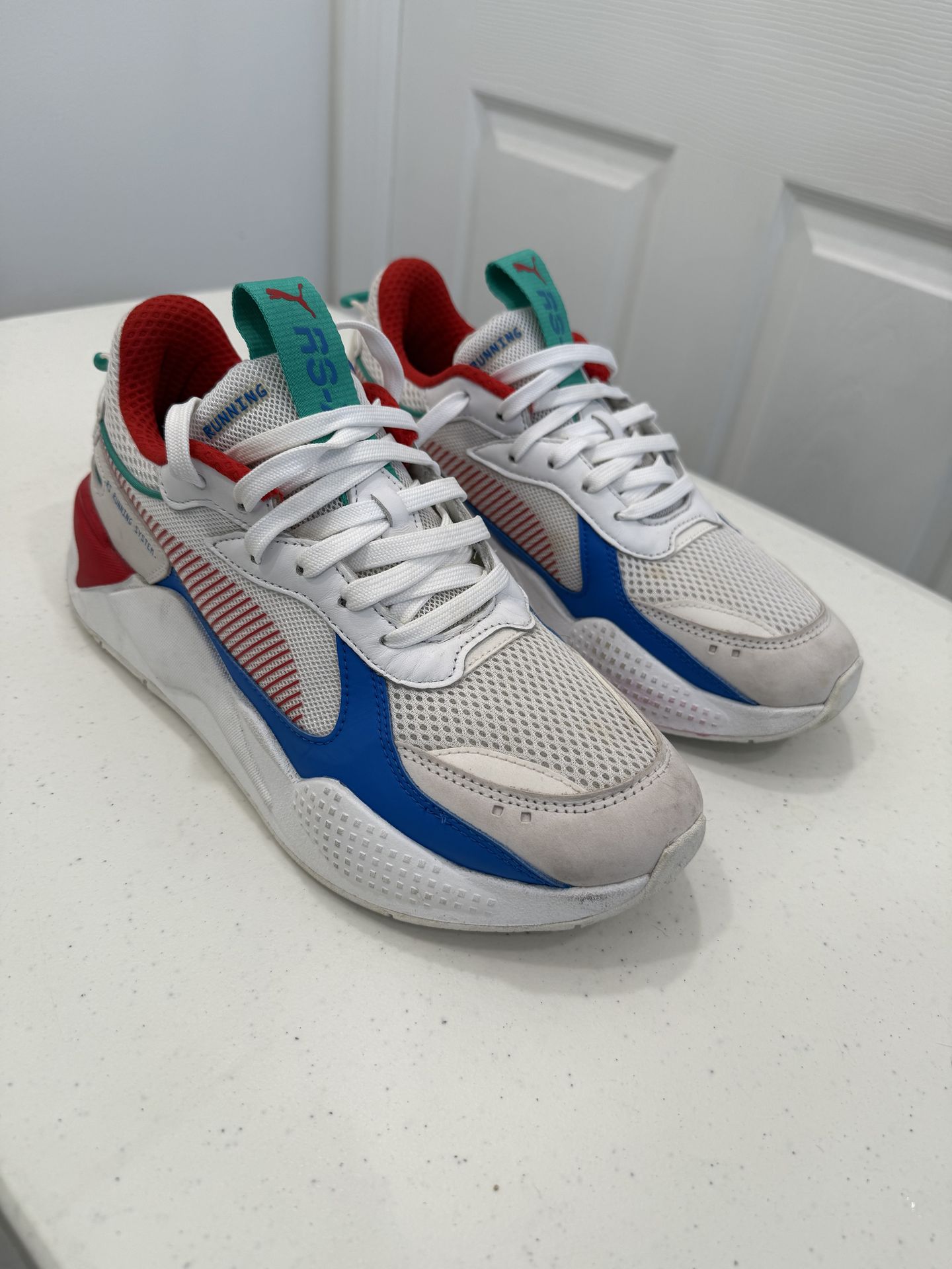 These are Puma RS-X Toys White High Risk Red style color. They are comfortable shoes and stylish for outdoor use and running. Men’s size 9 Estos son los Puma RS-X de estilo White High Risk Red. Son cómodos y elegantes para usar al aire libre y correr. Talla 9 para hombre.
