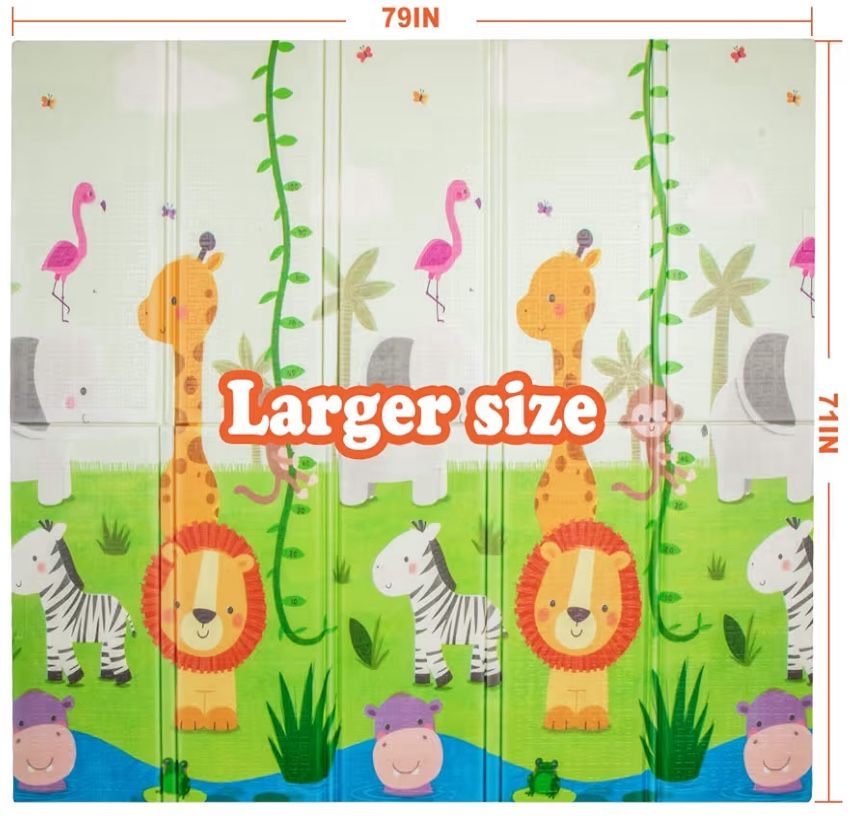 This is an awesome playmat! It is heavy duty with a 0.6” thickness, large dimensions (79”x71”), anti slip, waterproof, and fun jungle scene for toddlers to enjoy! Same areas have been slightly damaged. We have 4 of them to cover a total area of 158”x142”. Selling each for $30. A brand new one goes for $71.