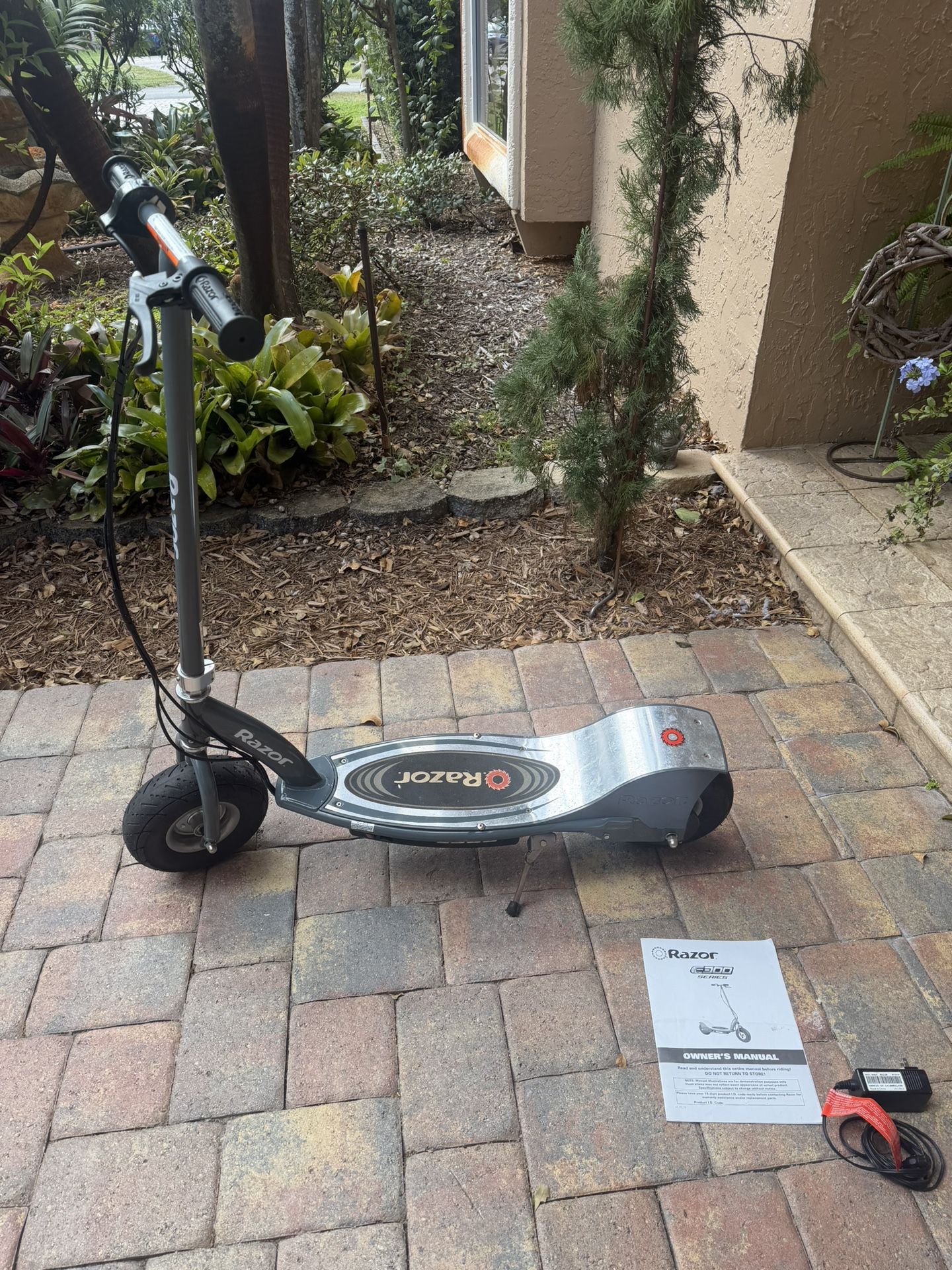 Razor E300 Electric Scooter with owner’s manual and charging cord. Color grey. Cash only.