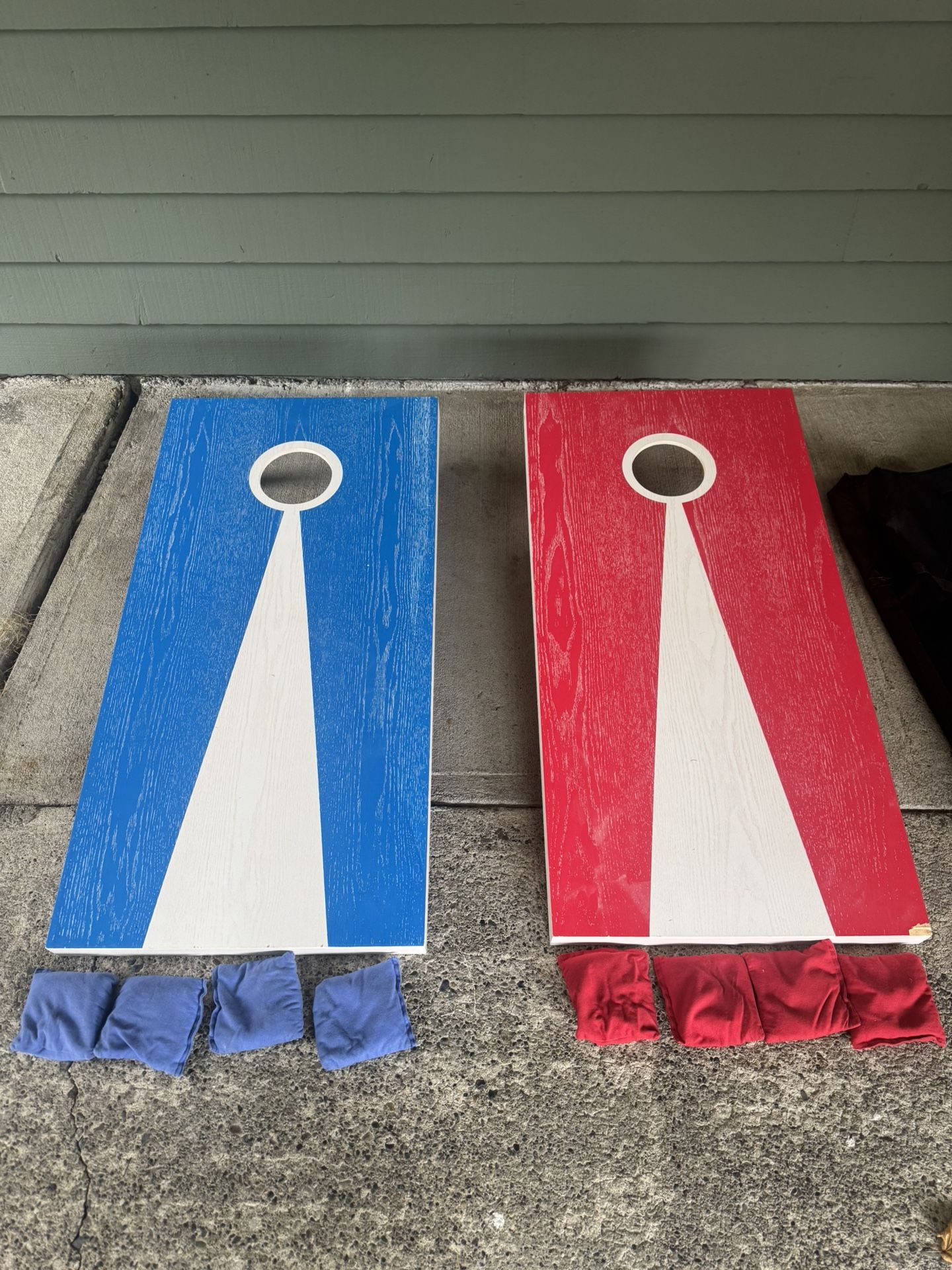 Corn hole set available. Slightly used. There is a chip on the bottom right side of the red one as you can see in the picture. Comes with a carrying bag. **Cash or Venmo Only **Local only**