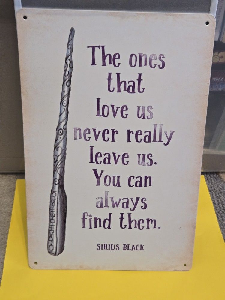 Harry Potter Sirius Black Quote Sign The following Sirius Quote is of the following: "The One that Love Us Never Really Leave Us. You can Always Find Them." Tin/ Aluminum Rustic/ Vintage Style Approx. Size 8" x 12" Easy to Hang or Prop Up ANYWHERE on ANY FLAT Surface Pre-Drilled Holes New Never Been Used Smoke and Animal Free Home **CHECK OUT MY OTHER LISTINGS FOR BUNDLING PRICING**