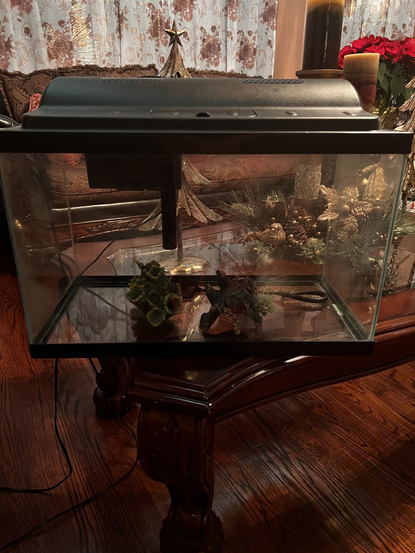 It’s a 10-15 gallon fish tank not sure comes with filter and lid with light. Accessories included fish net, rocks, 8 filter cartridges and some decorations everything works selling it because I got a bigger one it’s ready for some new fishes.
