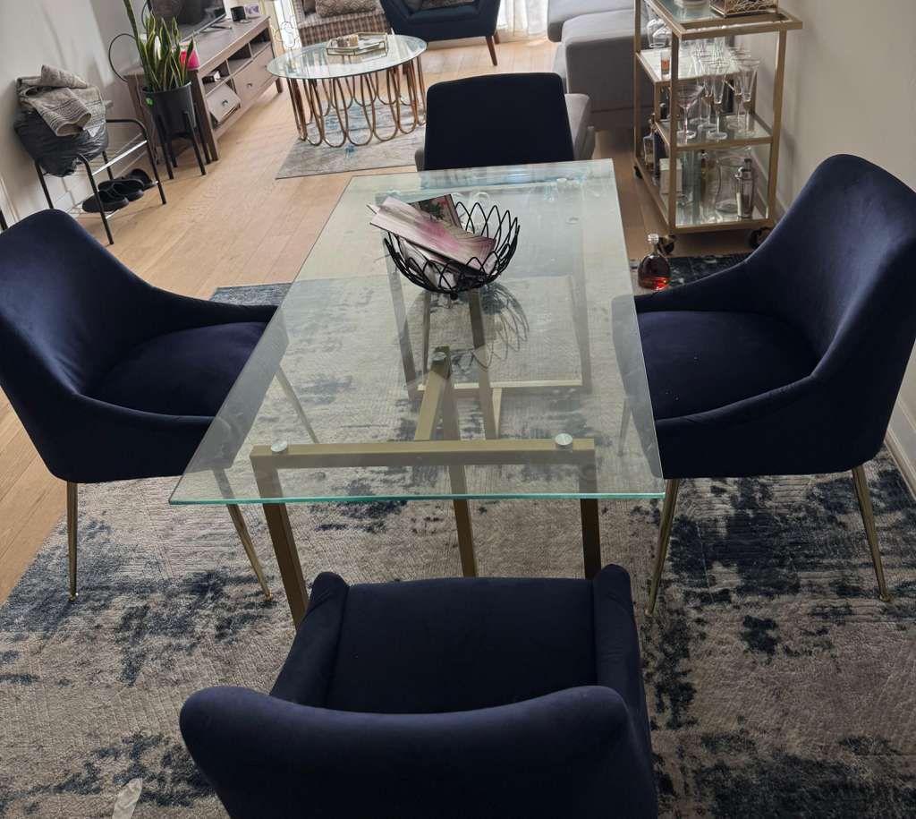 Beautiful modern dining table set featuring a thick glass top with a gold metal base and 4 navy velvet upholstered chairs. ✔️ Elegant and contemporary design ✔️ Very sturdy and stable ✔️ Comfortable cushioned chairs ✔️ Perfect for apartments or small dining spaces ✔️ Great condition Seats 4 comfortably. Glass top is thick and easy to clean. Pickup only.