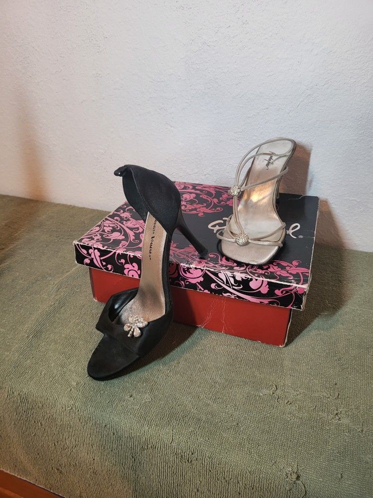 Detachable dragonfly charm on black heels. Elastic straps on silver heels.