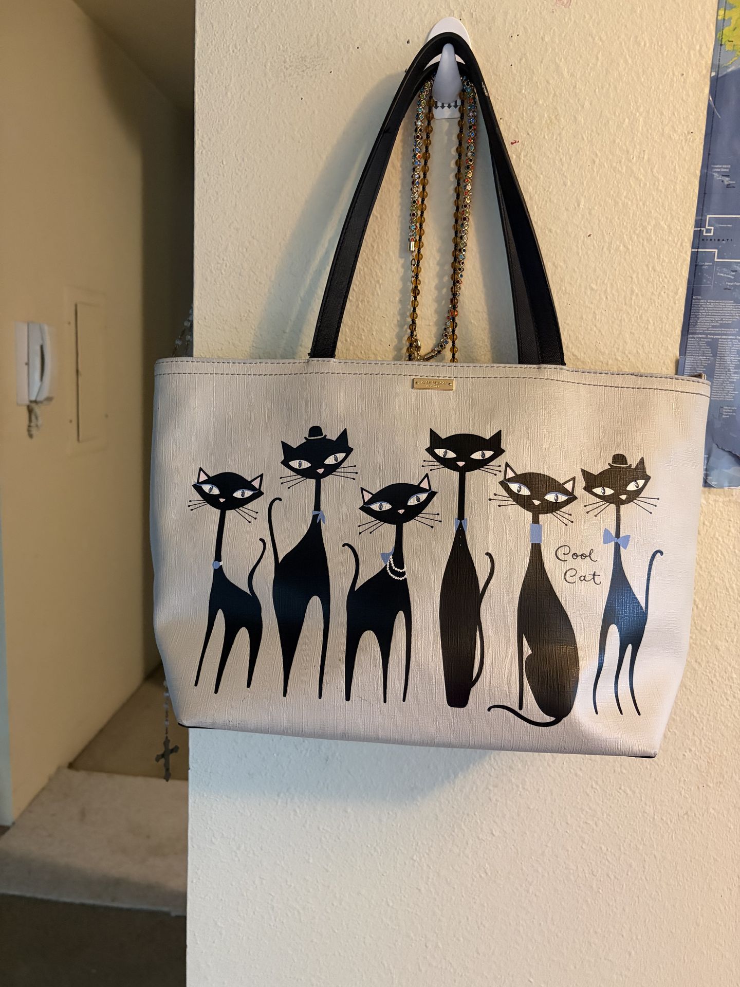 Almost new, good condition. Kate Spade New York ♠️ Large Jazz Things Up Cool Black Cat Tote Purse Bag . Original price $400. Item description from the seller. This Kate Spade tote bag is part of the "Jazz Things Up" collection, featuring a playful black cat design named Francis. The medium size makes it perfect for carrying all your essentials, while the durable material ensures long-lasting quality. The sleek while the cat theme adds a fun and whimsical element to the overall style. A unique stylish accessory to any wardrobe. List as Pre-owned. Final sale. Questions concerning please contact me.