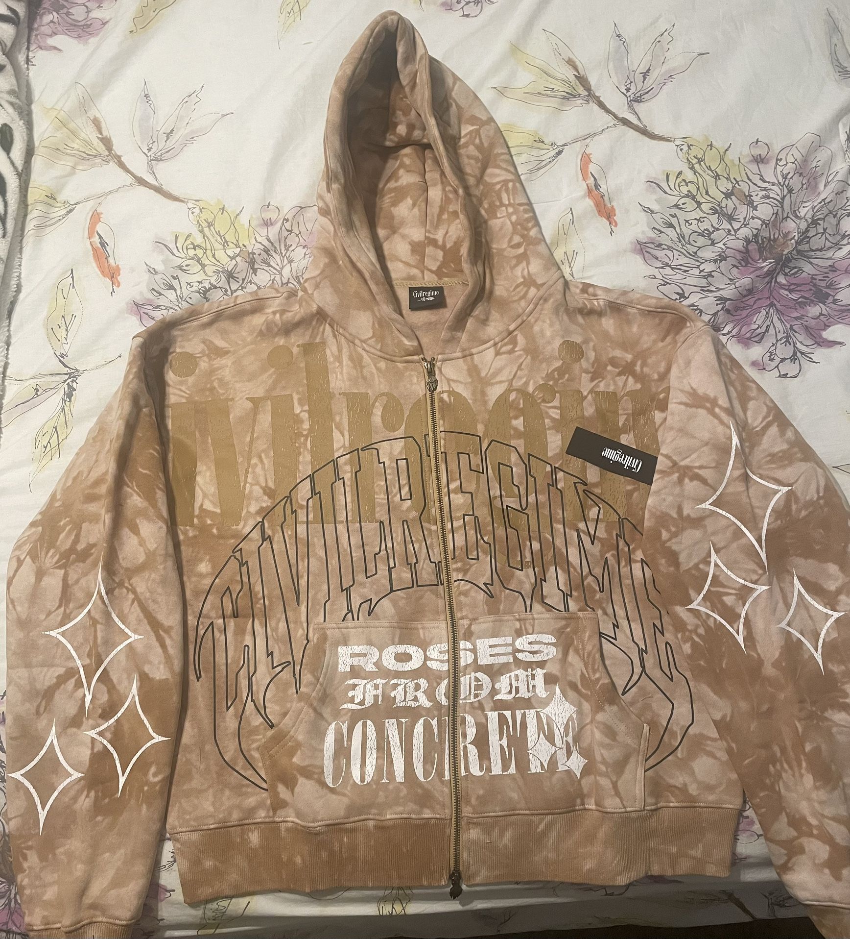 This hoodie is a large oversized, heavy duty hoodie which features a zip up front. Has the sandstorm wash style color with white lettering on the pockets. Very well-made and comfortable you gotta try this on.