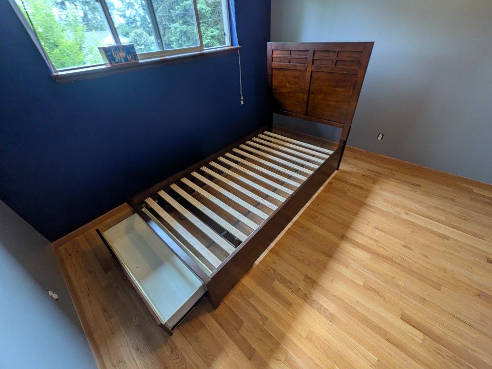 Brown wooden twin bed frame with a drawer. Headboard is 50" high, frame is 41 1/4" x 79 1/2" long. From a smoke free household.