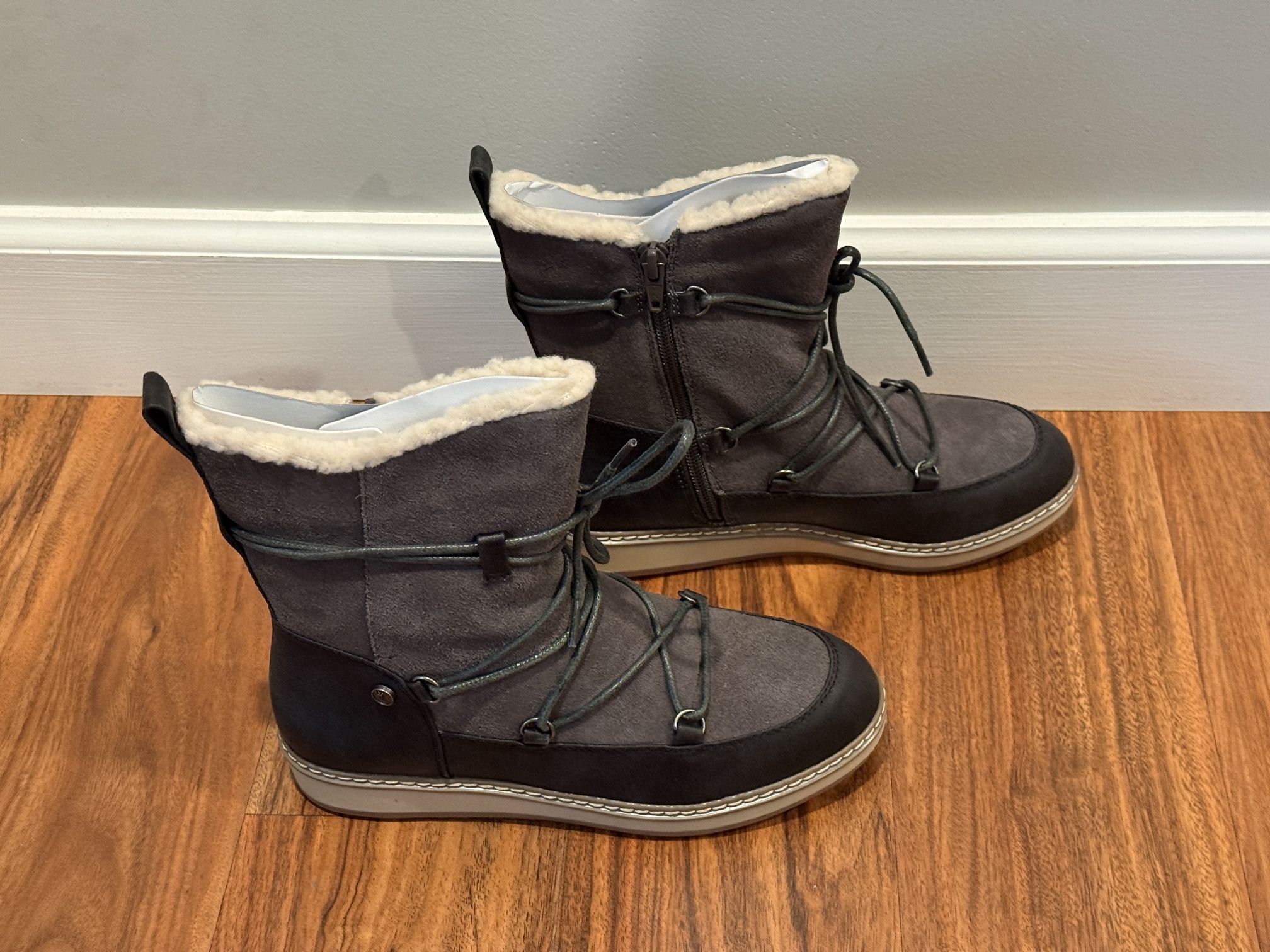 Brand new snow boots, faux suede material. Charcoal color, size 6M. Topaz style. Comes with box. Made by White Mountain.