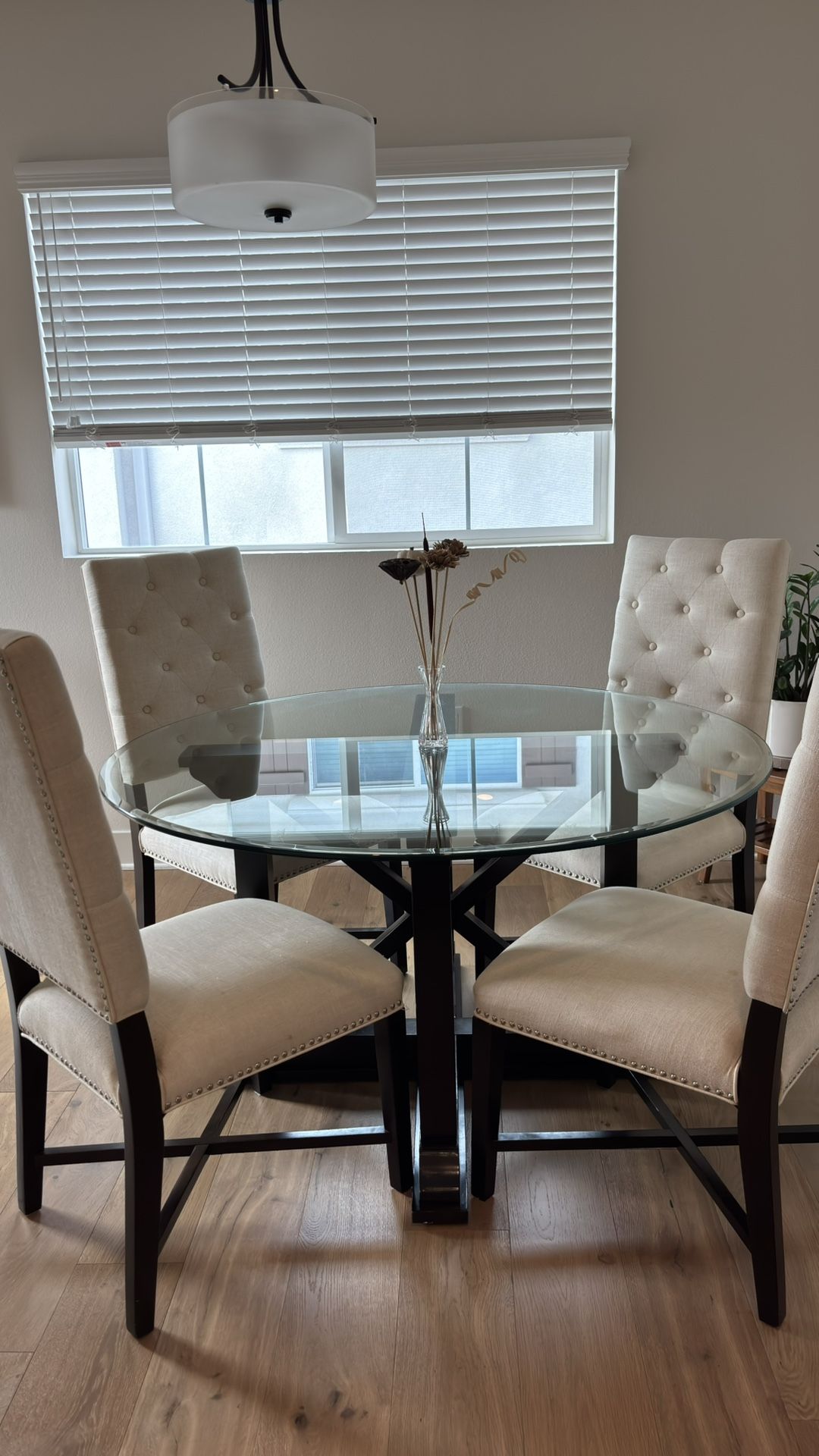 Selling a beautiful dining table set with a glass top and 4 matching chairs. Overall in good condition and perfect for a kitchen or dining area. • Glass top table • Includes 4 chairs • Sturdy and well-maintained Minor imperfections: • Small stains on one chair • Light scratch on the glass (purely cosmetic) Priced accordingly. Pickup only. Message me if interested!