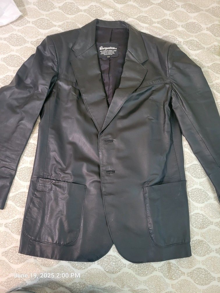 From Argentina, Men's Kerguelen Leather Blazer/suit coat. Size 54 long. Lined. Vented back. Side pockets plus inside breast pocket.