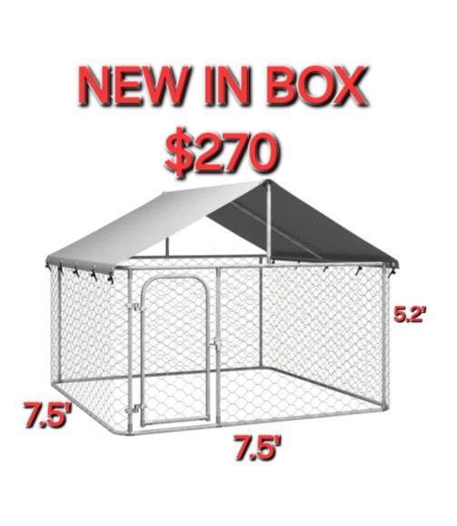 Brand new in box 7.5 x 7.5 x 5.2 ft large dog kennel with galvanized metal frame. Lockable door, water proof tarp, anti ultraviolet SUN Protection tarp roof cover. Great for shade and heat protection. Easy wrap around assembly. Just over 5 ft tall with Apex Frame. Great for garden fence , dog run, animal cage , pigs, goats chickens, puppies , xl dogs, coyote protection. I offer dog crates, houses, playpens whelping boxes as well. Please see my page. Jaulas de mascota