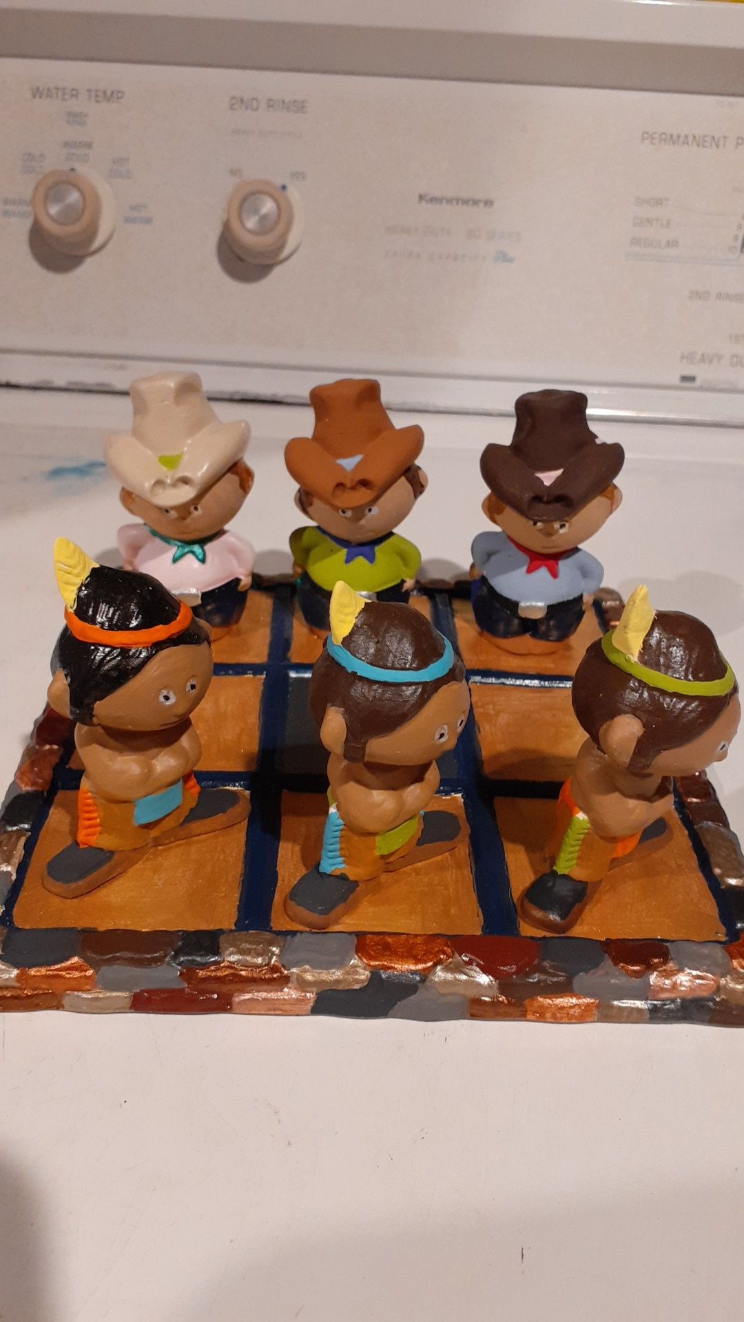 Hand painted cowboys and Indians tic tac toe board. Time to play