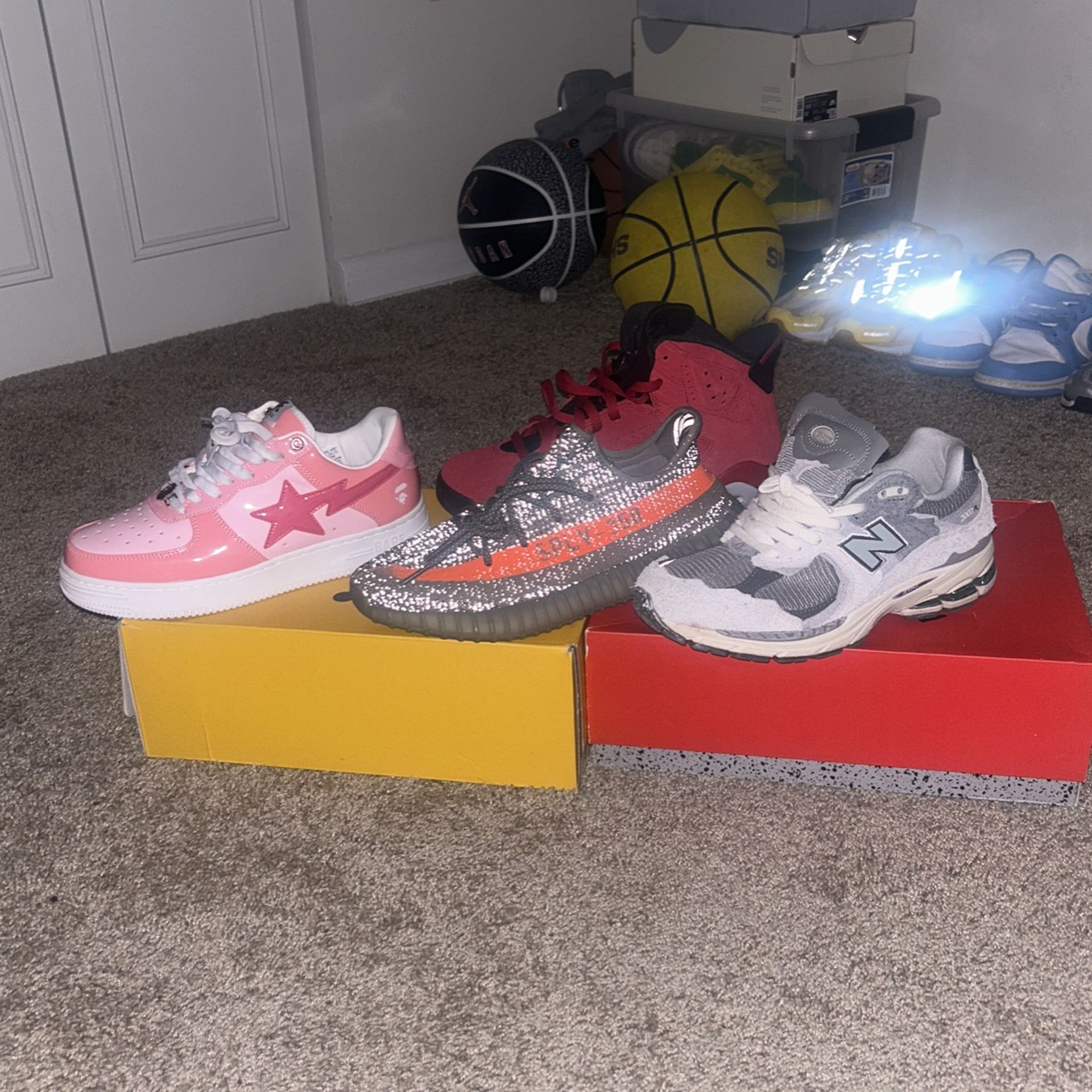 All For Sale Need Gone !!!! Bape And New Balance No Box ! Other Two Have Boxes ! Cash Is King !!! Need Gone By 2mrw Bape & NB 9.5 6s And Yeezy Size 10