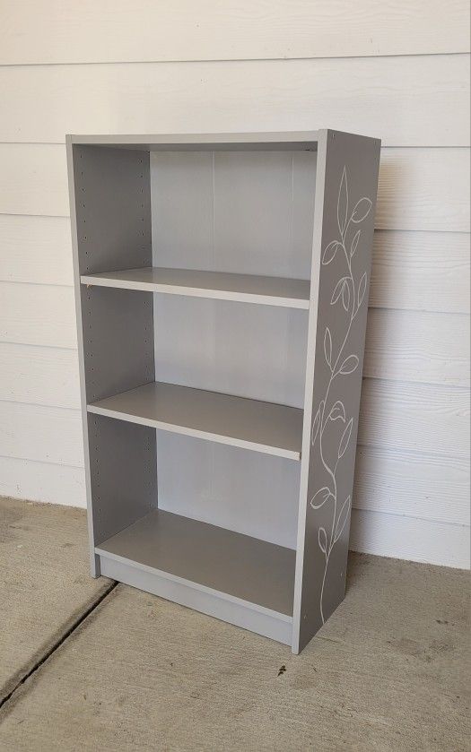Refurbished, one-of-a-kind, grey bookshelf with white vines hand painted on each side. Perfect for any home living rooms, playroom, or cozy bedroom storage. 2 removable shelves with movable plugs to rearrange the shelves however you want. Dimensions: (L x W x H) 22.5" x 10" x 40"