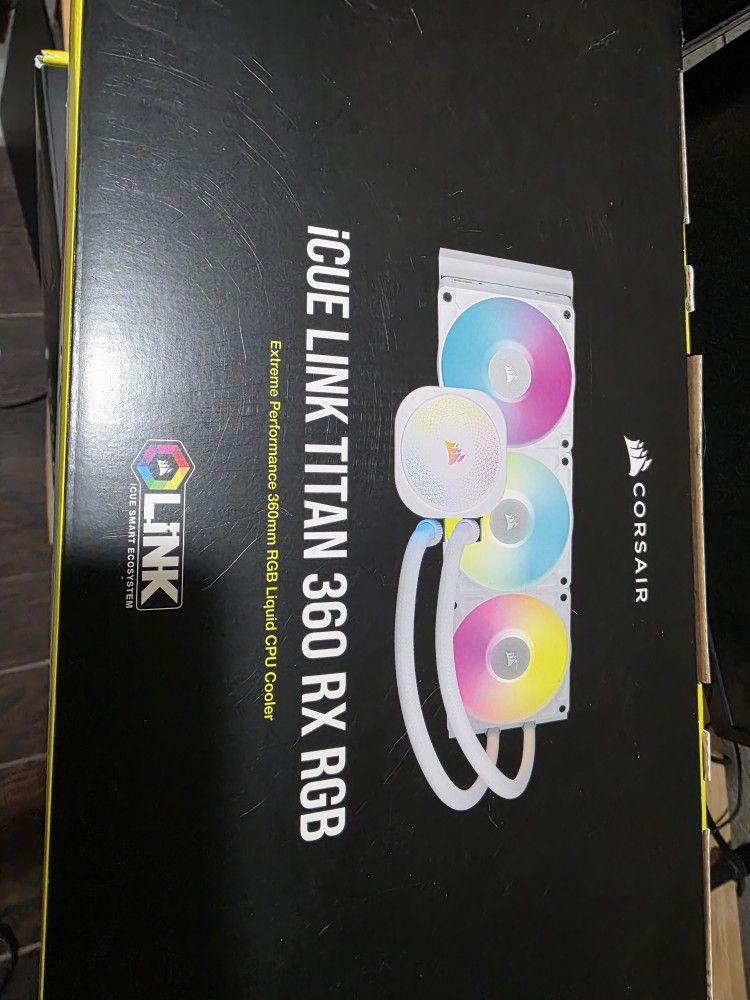 Bought for a build, but didn't end up using it. Tested and works perfectly. CORSAIR iCUE Link Titan 360 RX RGB Liquid CPU Cooler – 360mm AIO – Low-Noise – FlowDrive Cooling Engine – Intel LGA 1851/1700, AMD AM5/AM4 – 3X RX120 RGB Fans – iCUE Link System Hub Included – White All-in-One CPU Cooling Made Easy with iCUE LINK: High-performance, low-noise AIO cooling helps you get the most out of your CPU, taking advantage of the iCUE LINK ecosystem for simplified, streamlined connections. Effortless Connectivity and Intelligent Design: iCUE LINK technology lets you connect all your components in sequence using universal connectors, all plugged into a single port on the included iCUE LINK System Hub. Build faster, reduce cable clutter, and create a more intelligent, cohesive system setup. FlowDrive Cooling Engine: A performance pump powered by a three-phase motor, combined with a precision engineered cold plate surface profile to ensure maximum contact with your CPU’s integrated heat spreader, form CORSAIR’s ultra-efficient FlowDrive engine. Pre-Mounted iCUE LINK RX RGB Fans: RX RGB fans are specifically engineered for high airflow and static pressure, excelling as radiator cooling fans. CORSAIR AirGuide technology and Magnetic Dome bearings deliver unrivaled cooling performance and low noise. Quiet PWM-Controlled Cooling and Zero RPM Mode: Dictate your exact fan speeds up to 2,100 RPM with PWM control, plus support for Zero RPM PWM signals allows fans to stop entirely at low temperatures, eliminating fan noise completely. Compatible with Intel 1851, Intel 1700, AMD AM5, AMD AM4.