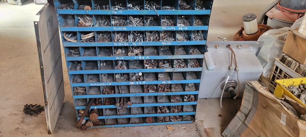 Nut and bolt bin. Full of many sizes of standard SAE hardware. Down sizing my garage.