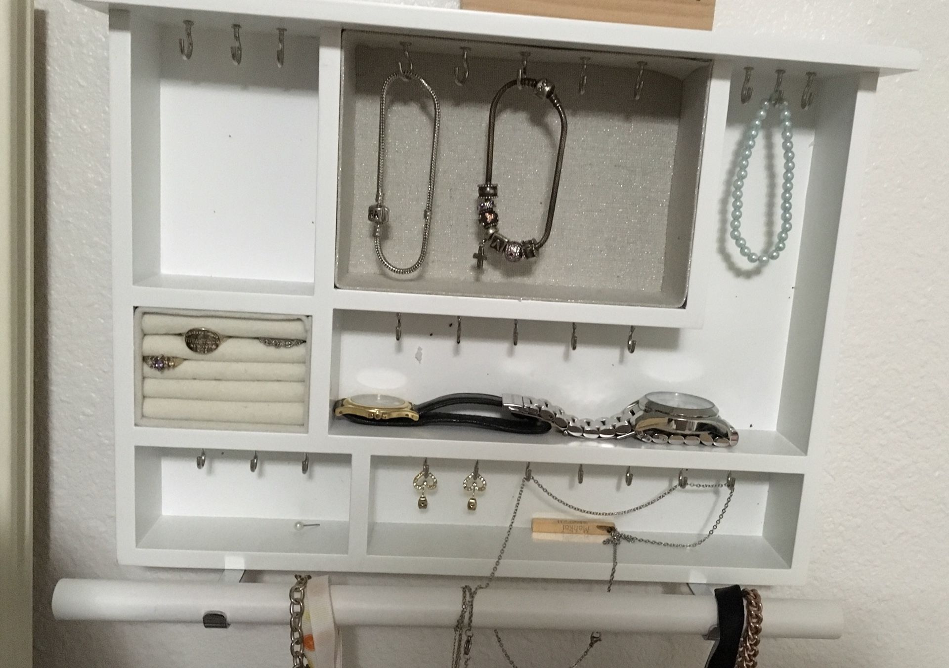Used white wood Jewelry holder. Hold bracelets, earrings, watches, necklace and rings. Great condition